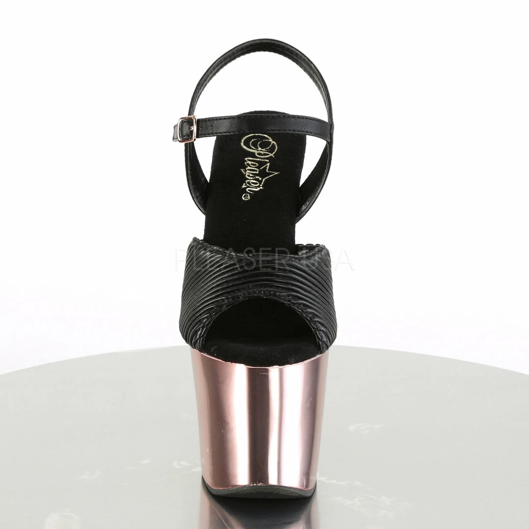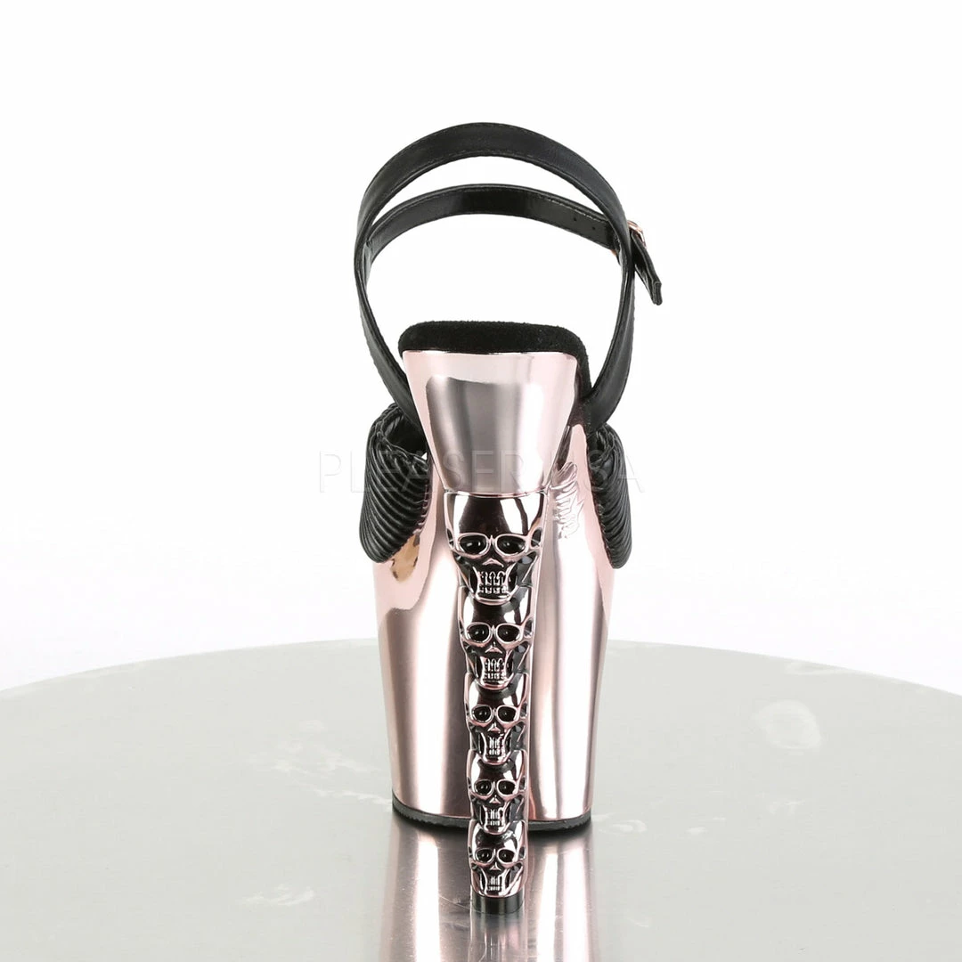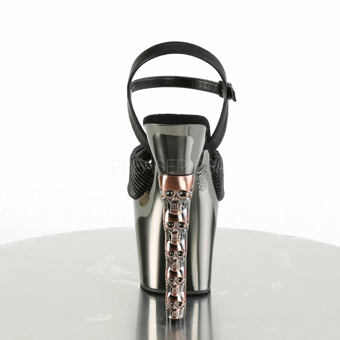 7″ (17.8cm)Β heel, 3 1/4″ (8.3cm) chrome plated platform ankle strap sandal with five skulls stacked heel.