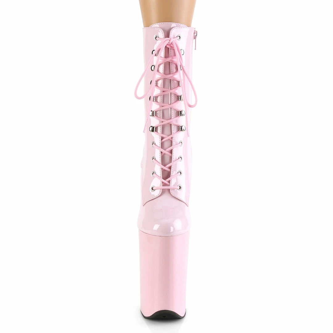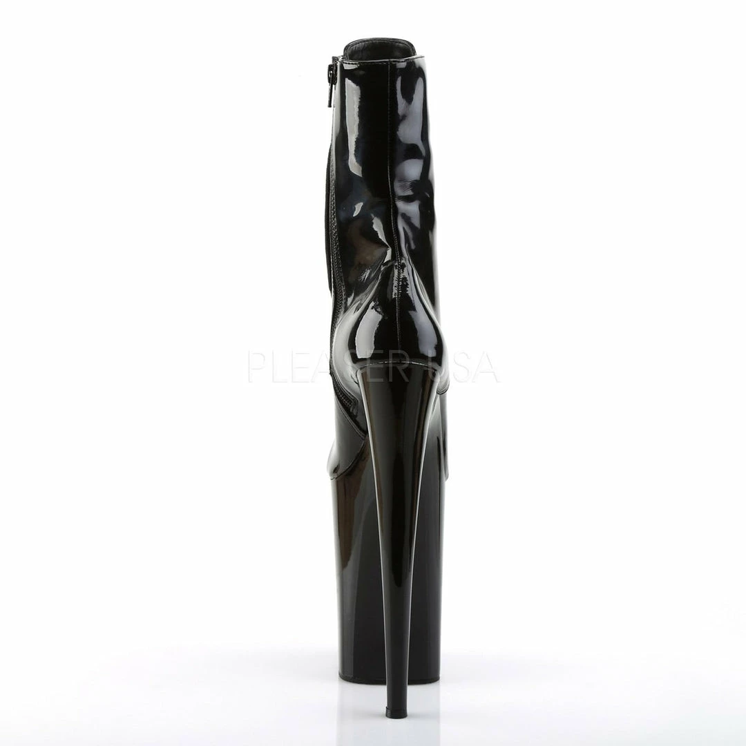 9″ (22cm) heel, 5 1/4 ” (13.3cm) platform front lace-up ankle boot with full inner side zipper.