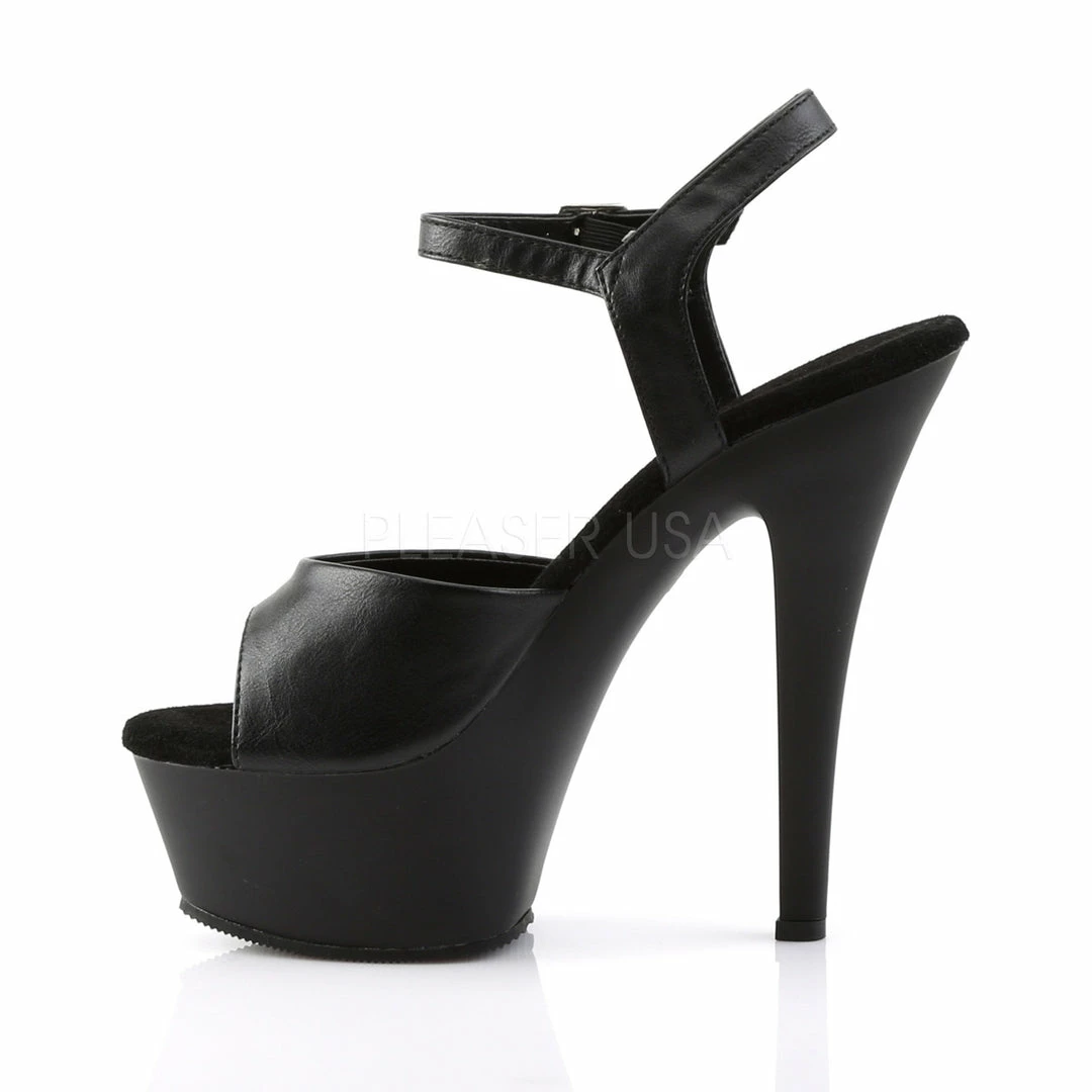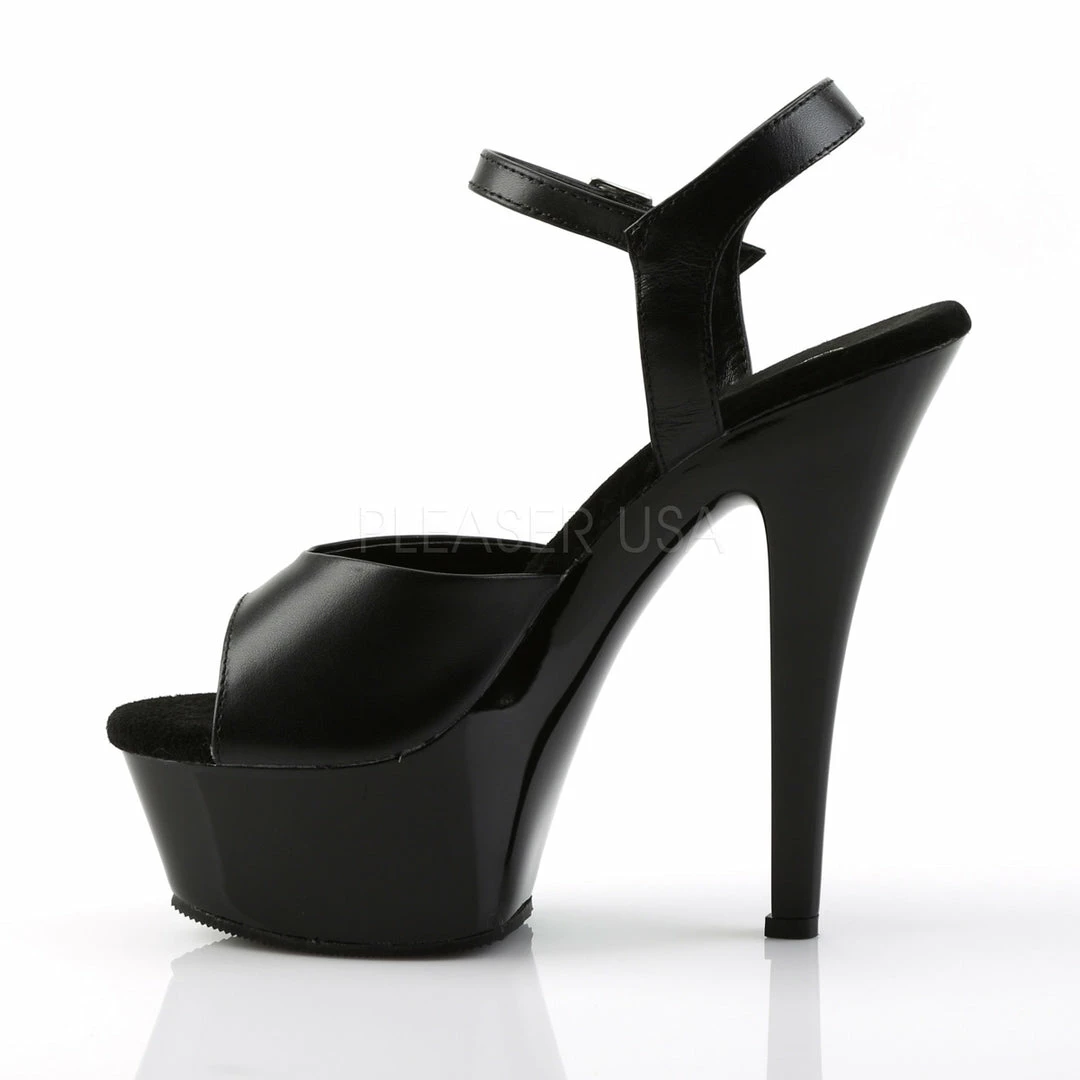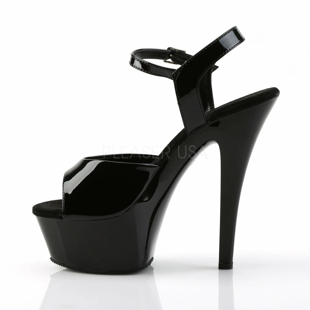 6″ (15.2cm) heel, 1 3/4″ (4.5cm) platform ankle strap sandal.