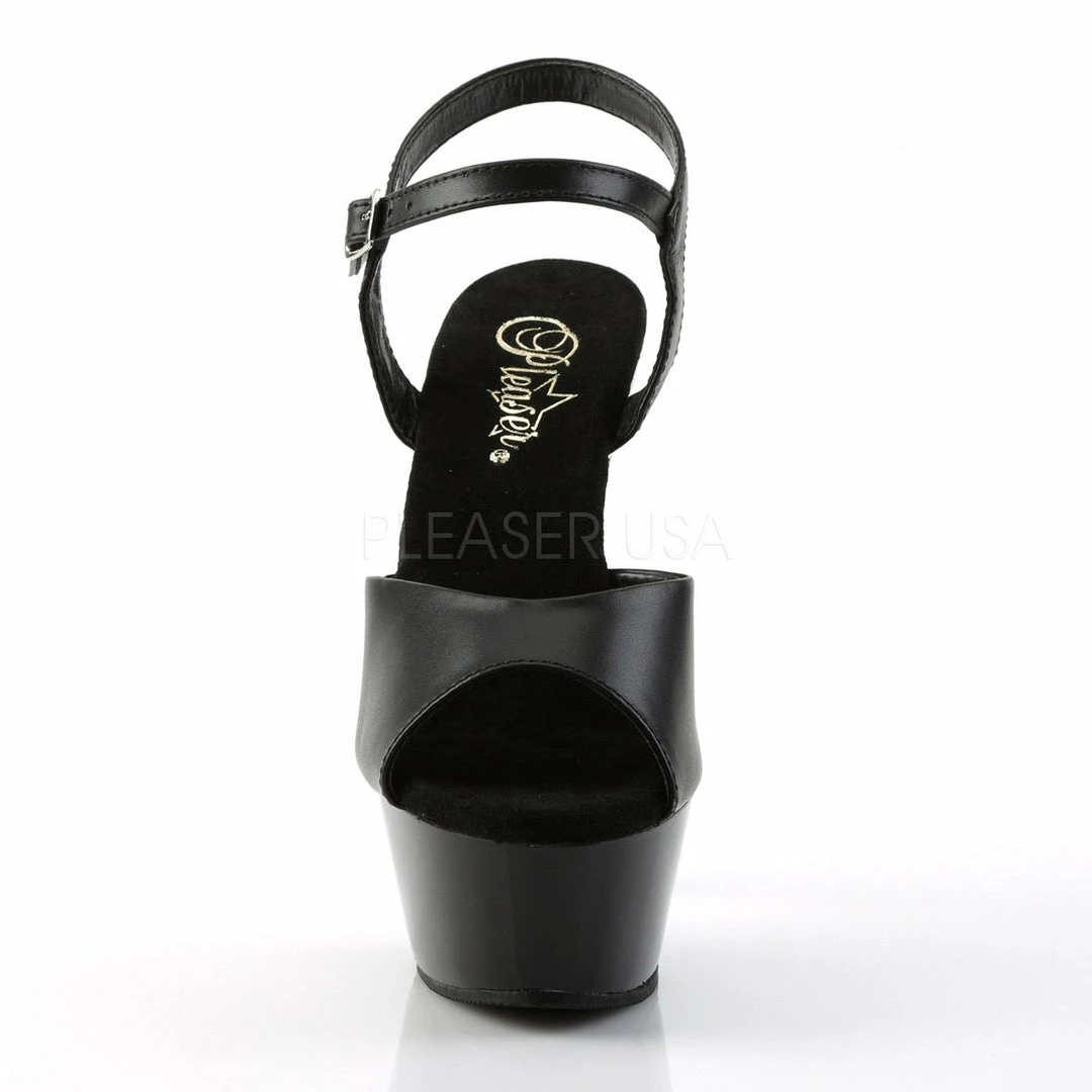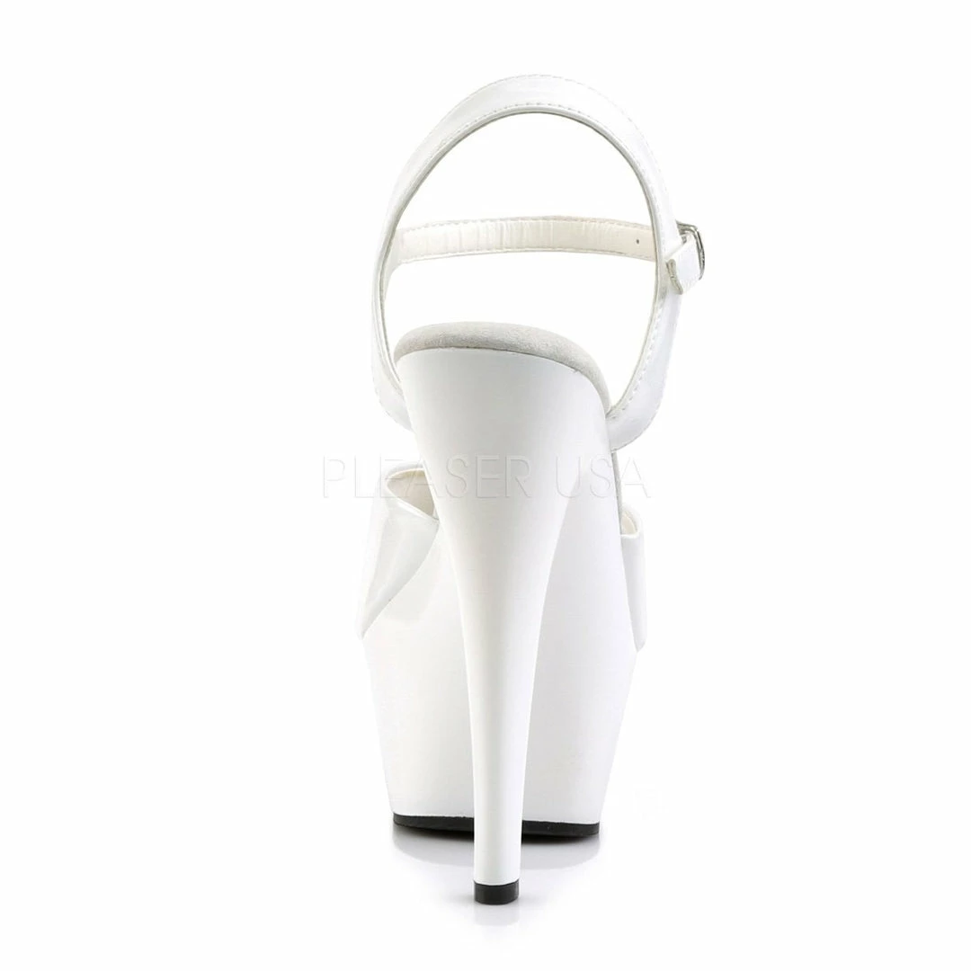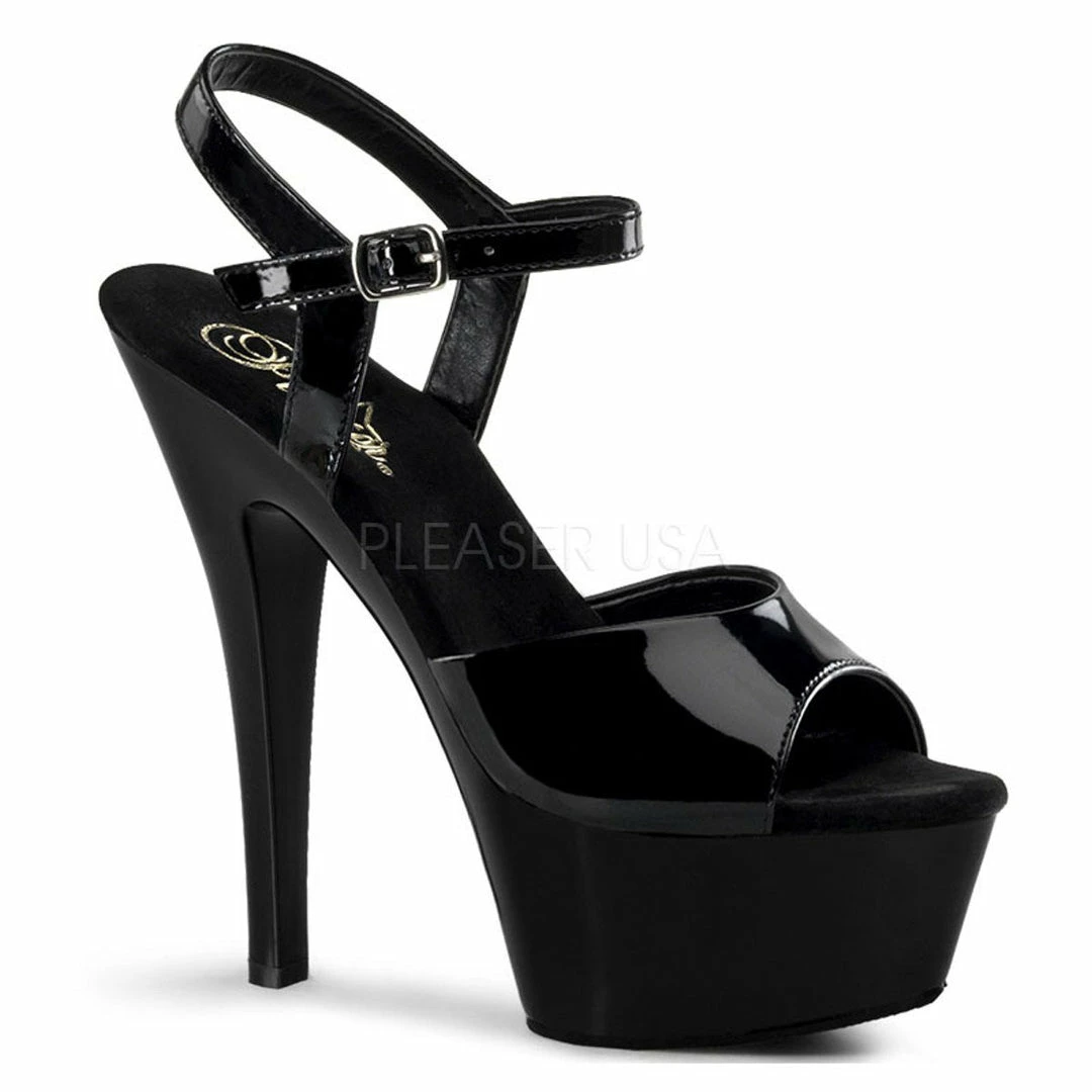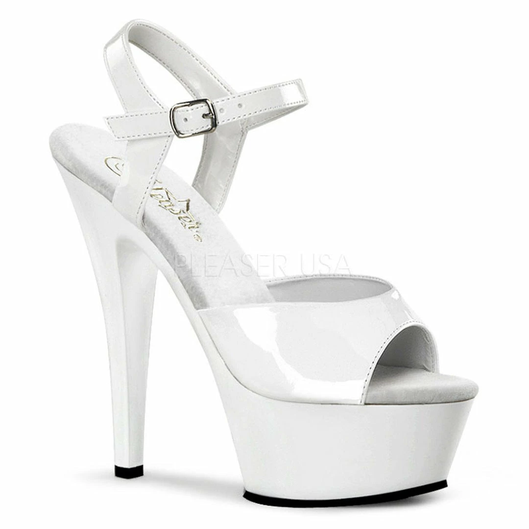 6″ (15.2cm) heel, 1 3/4″ (4.5cm) platform ankle strap sandal.