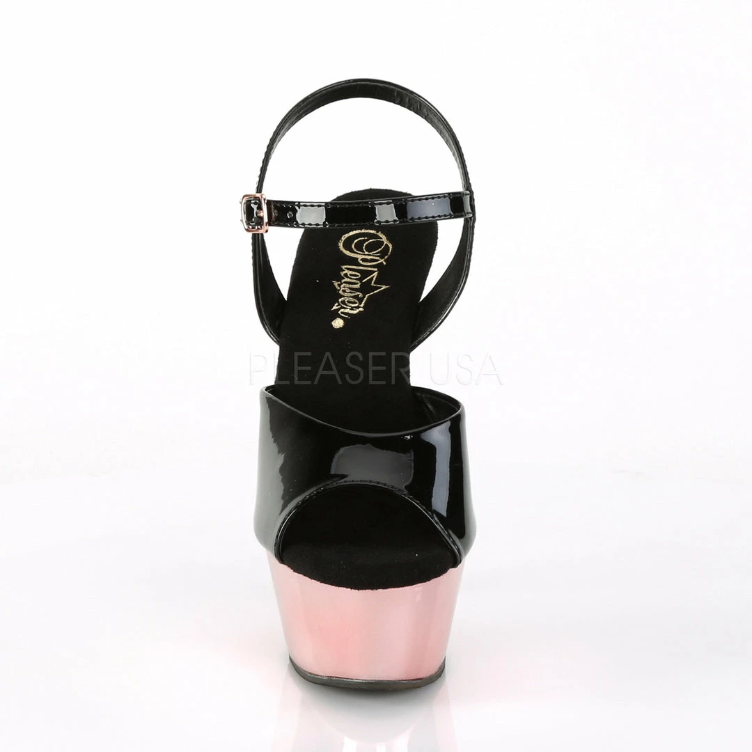 6″ (15.2cm) heel, 1/3/4″ (4.5cm) chrome plated platform ankle strap sandal.Β