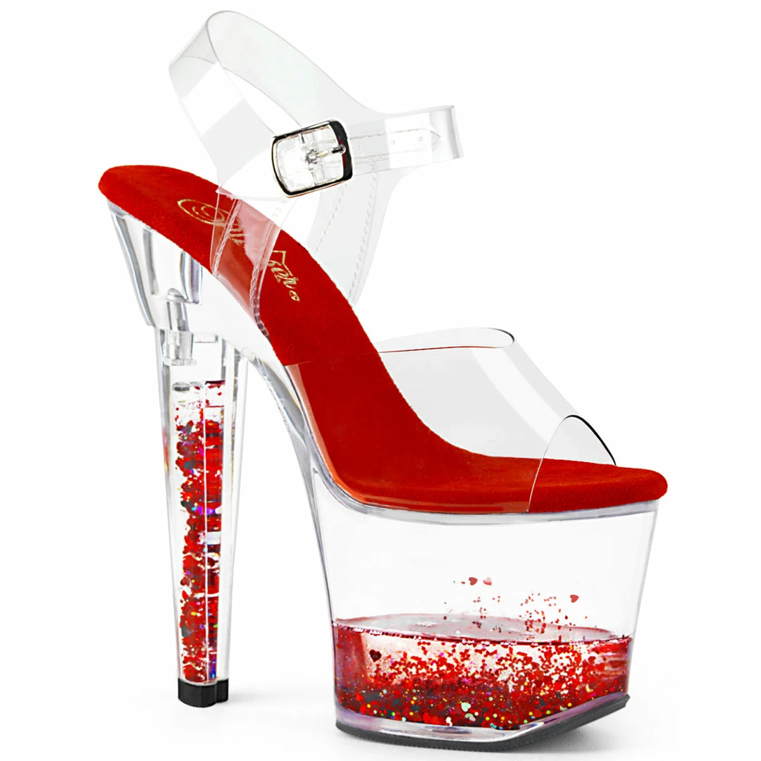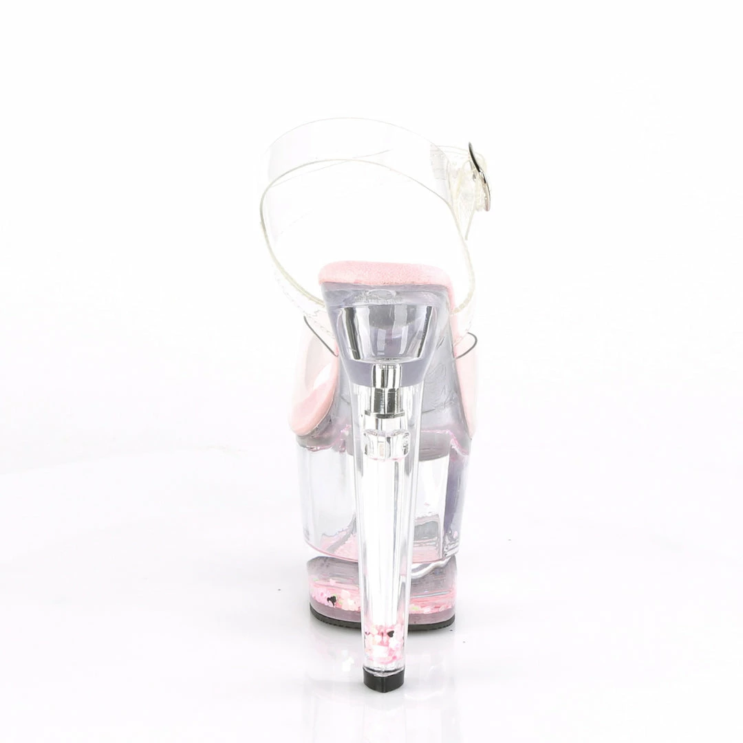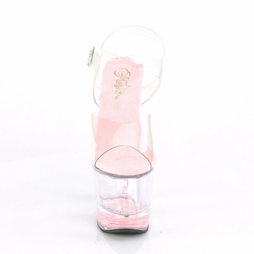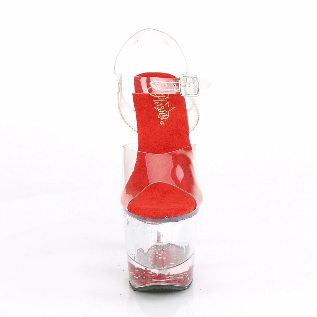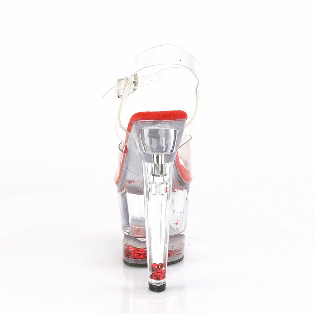 7″ (17.8cm) Heart shaped heel, 2 3/4″ (7cm) platform ankle strap sandal featuring the platform and heel infused with flowing liquid and floating glitter hearts.