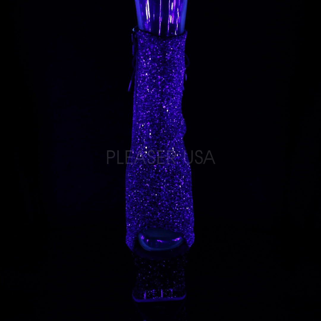 7″ (17.8cm) heel, 2 3/4″ (7cm) cut out platform open toe/heel lace up ankle boot with hidden zip pocket featuringΒ blacklight reactiveΒ swimming mermaid inside the platform and mini iridescent glitters on the entire platform bottom.