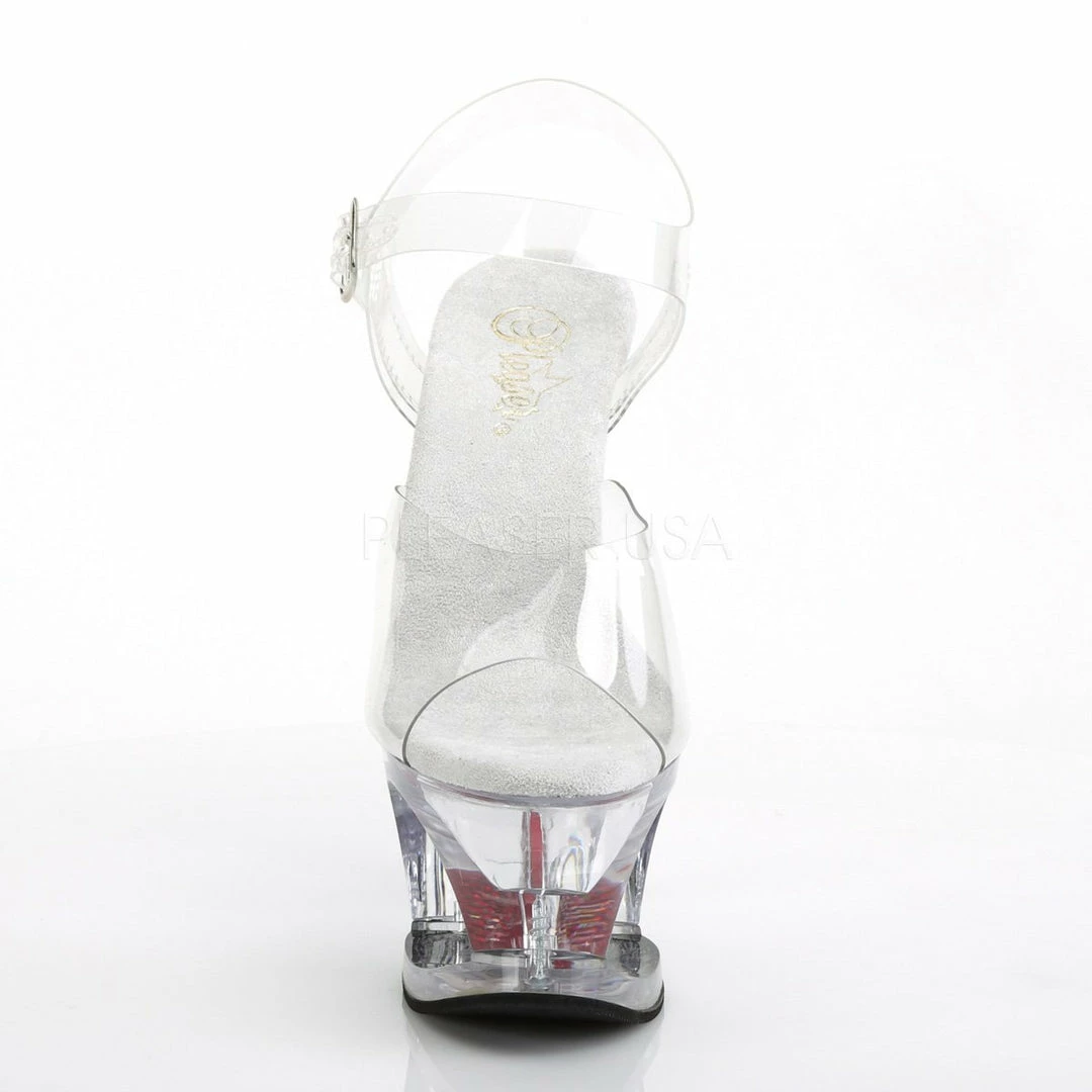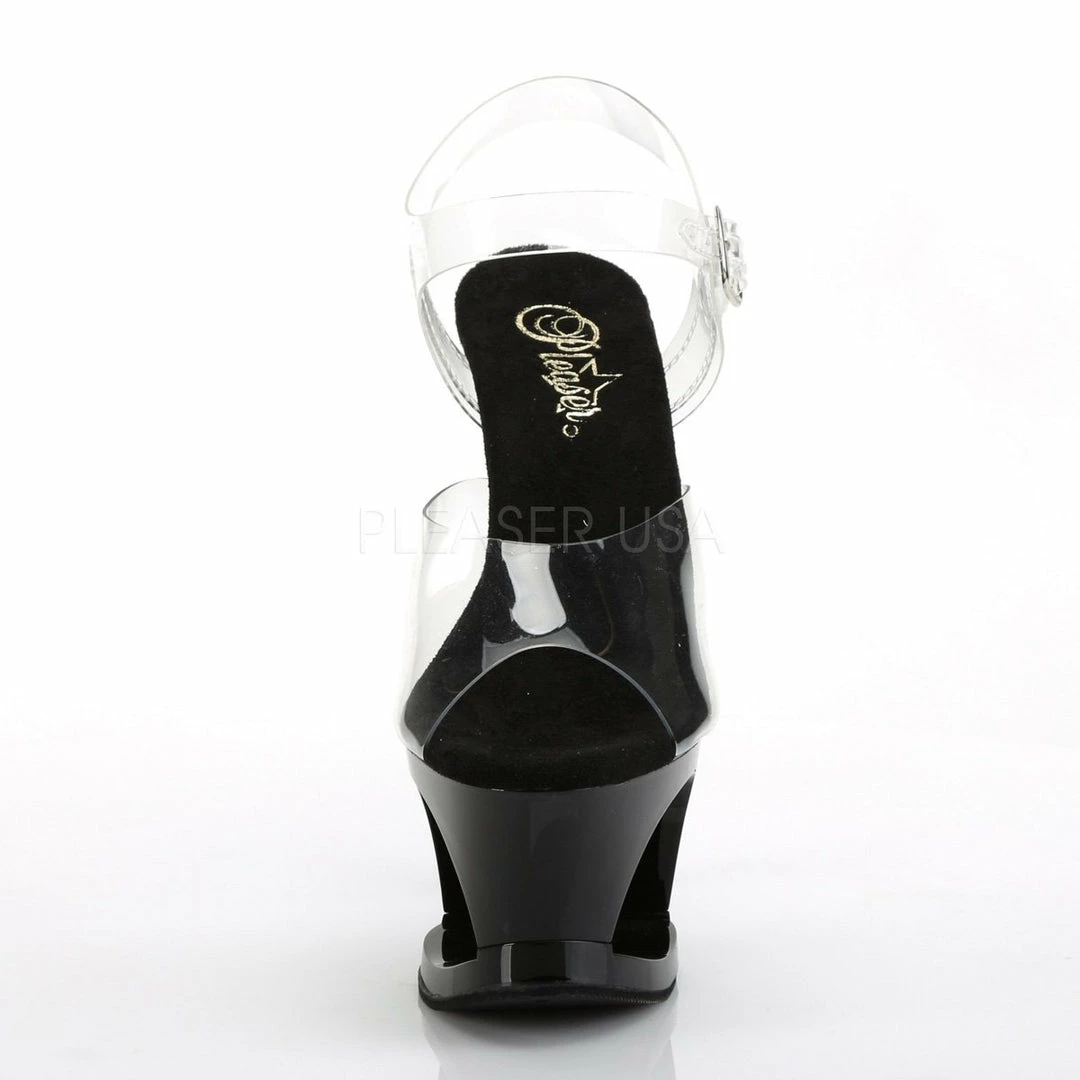 7″(17.8cm) heel, 2 3/4″ (7cm) cut out platform ankle strap sandal featuring rhinestone heart in the platform.