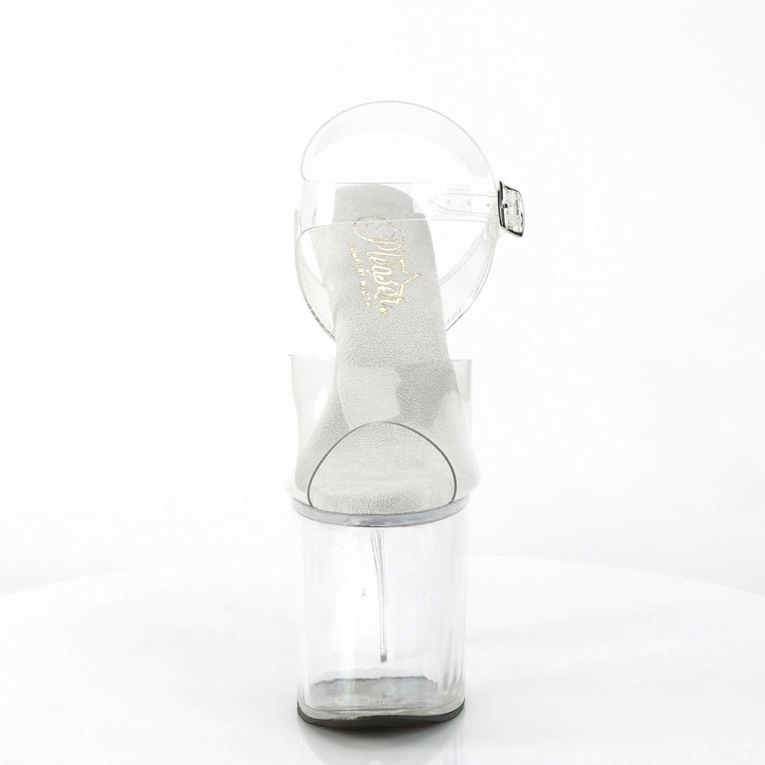 8″ (20cm) heel, 4″ (10cm) platform comfort width ankle strap sandal.