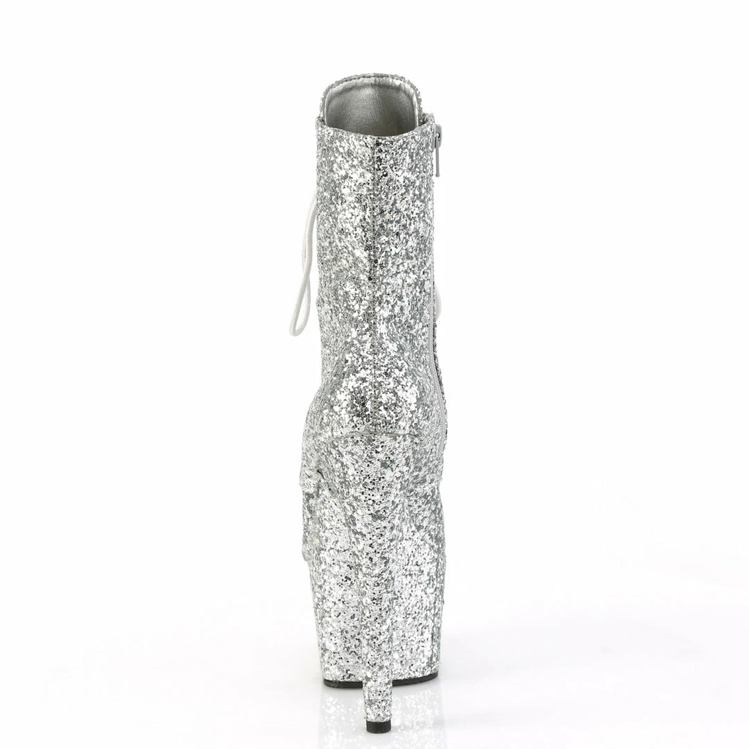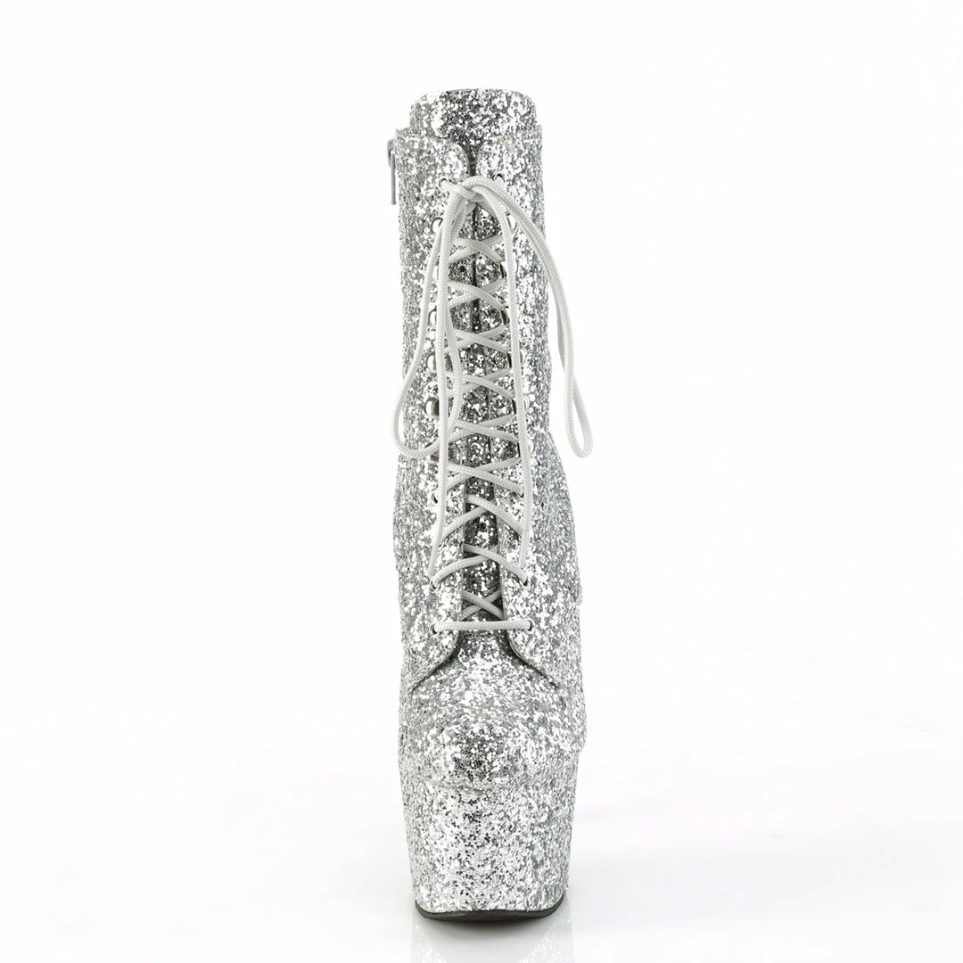 7″ (17.8cm) heel, 2 3/4″ (7cm)Β platform lace-up front glitter ankle bootΒ featuringΒ fully wrapped platform bottom and inside zip closure.