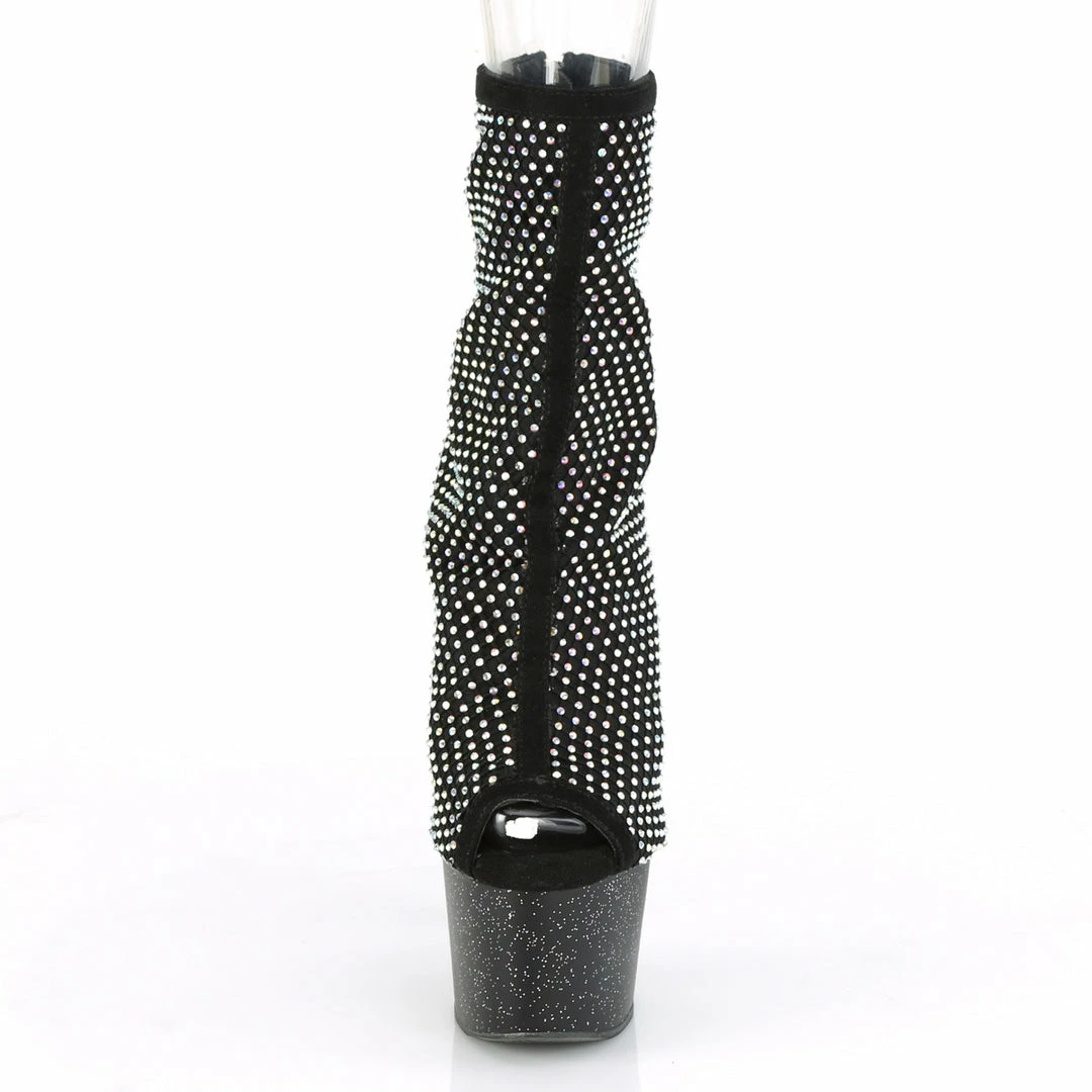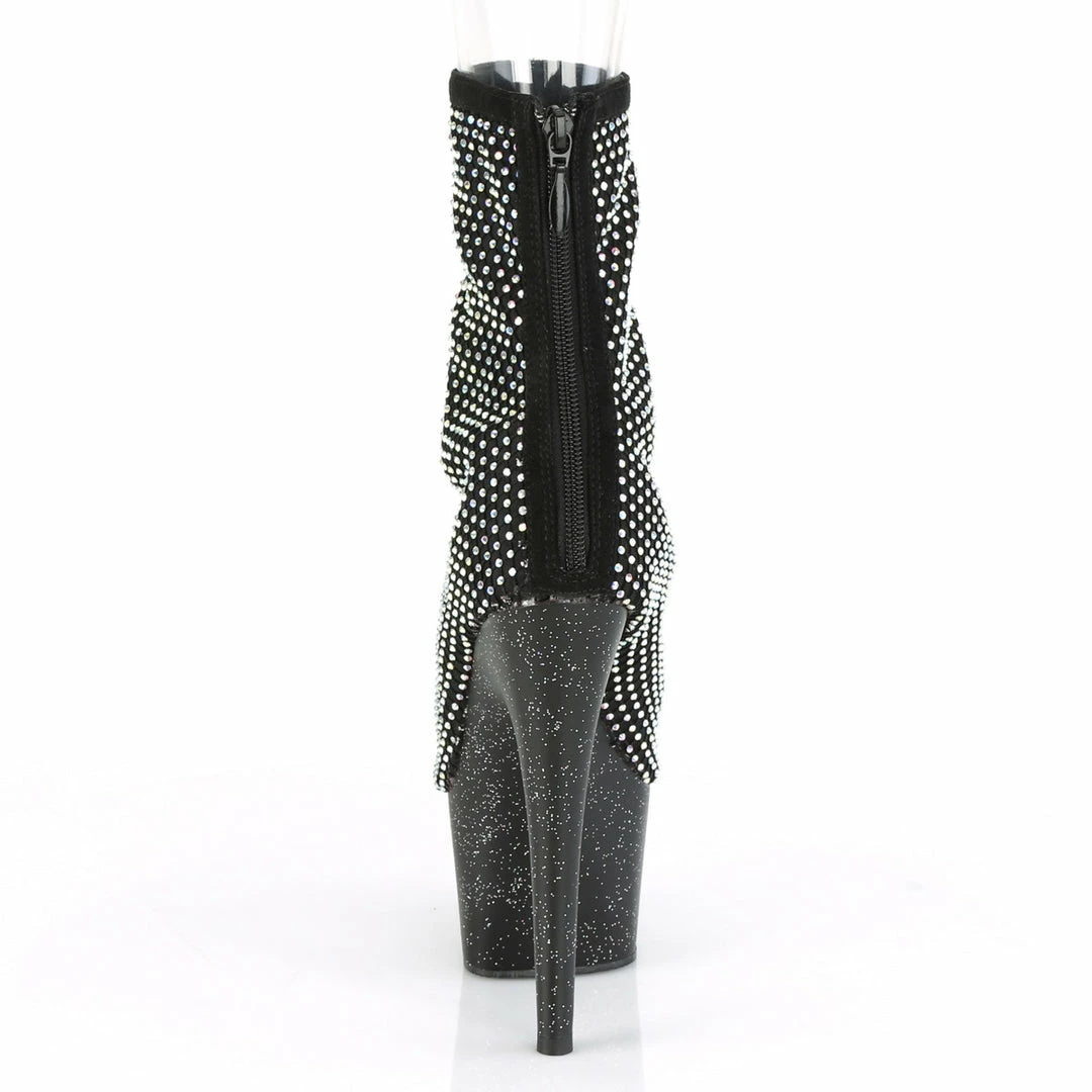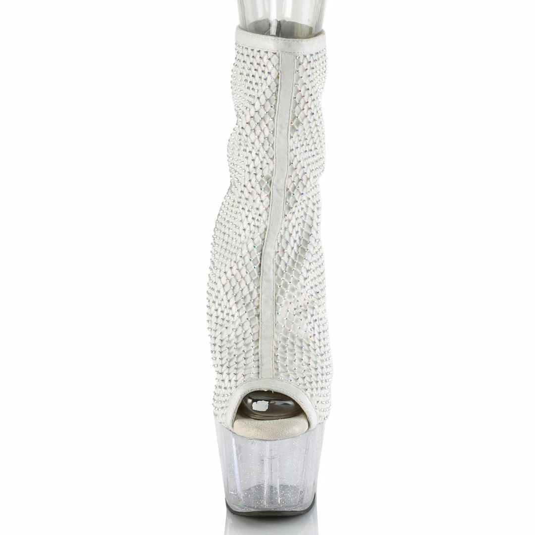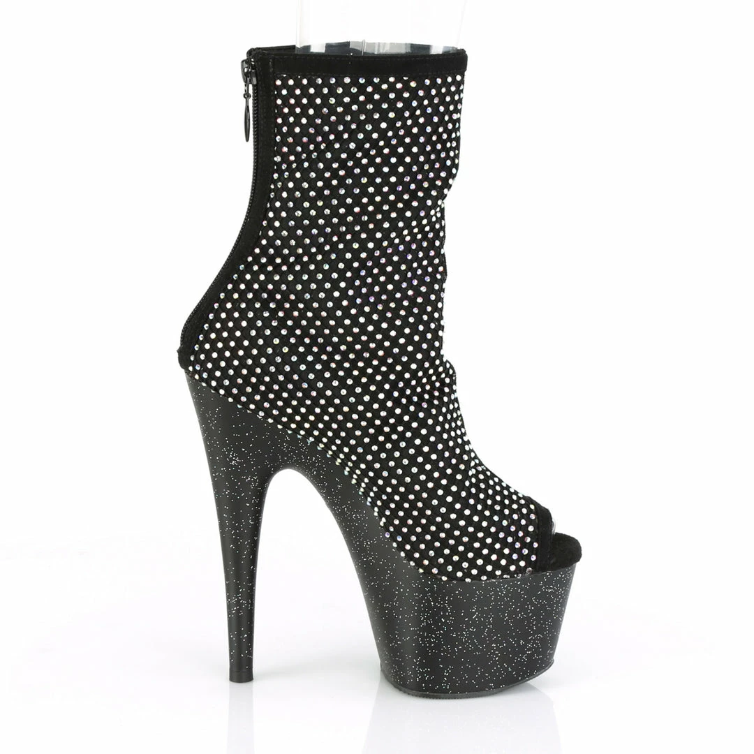 7″ (17.8cm) heel, 2 3/4″ (7cm) platform peep toe ankle boot featuring faux suede upper with AB rhinestones mesh overlay and mini iridescent glitter on the entire platform bottom. Back zip closure.