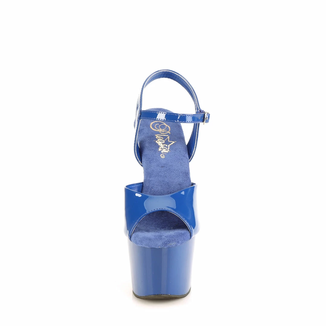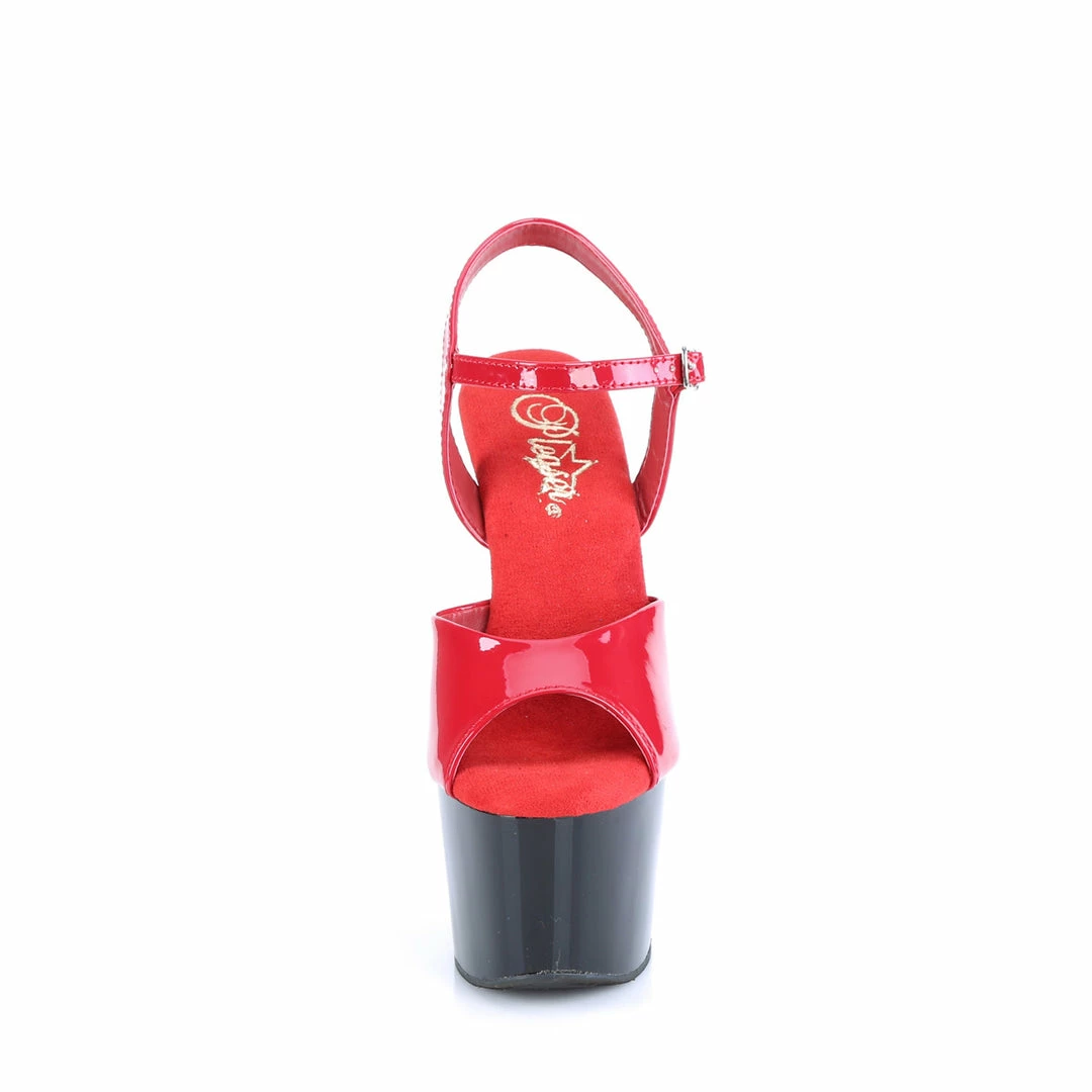 7″ (17.8cm) Stiletto heel, 2 3/4″ (7cm) platform ankle strap sandal.