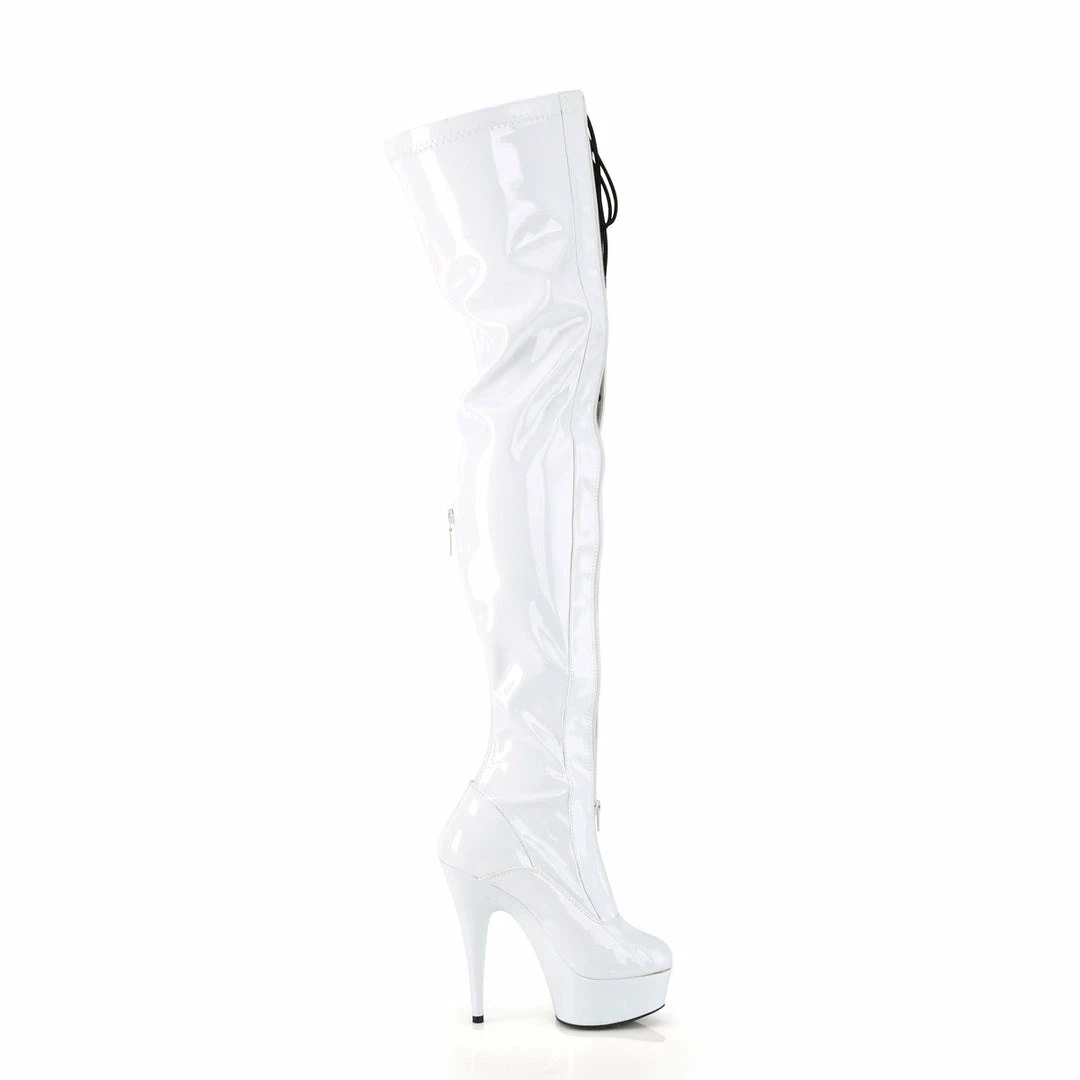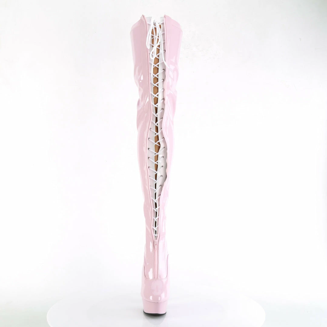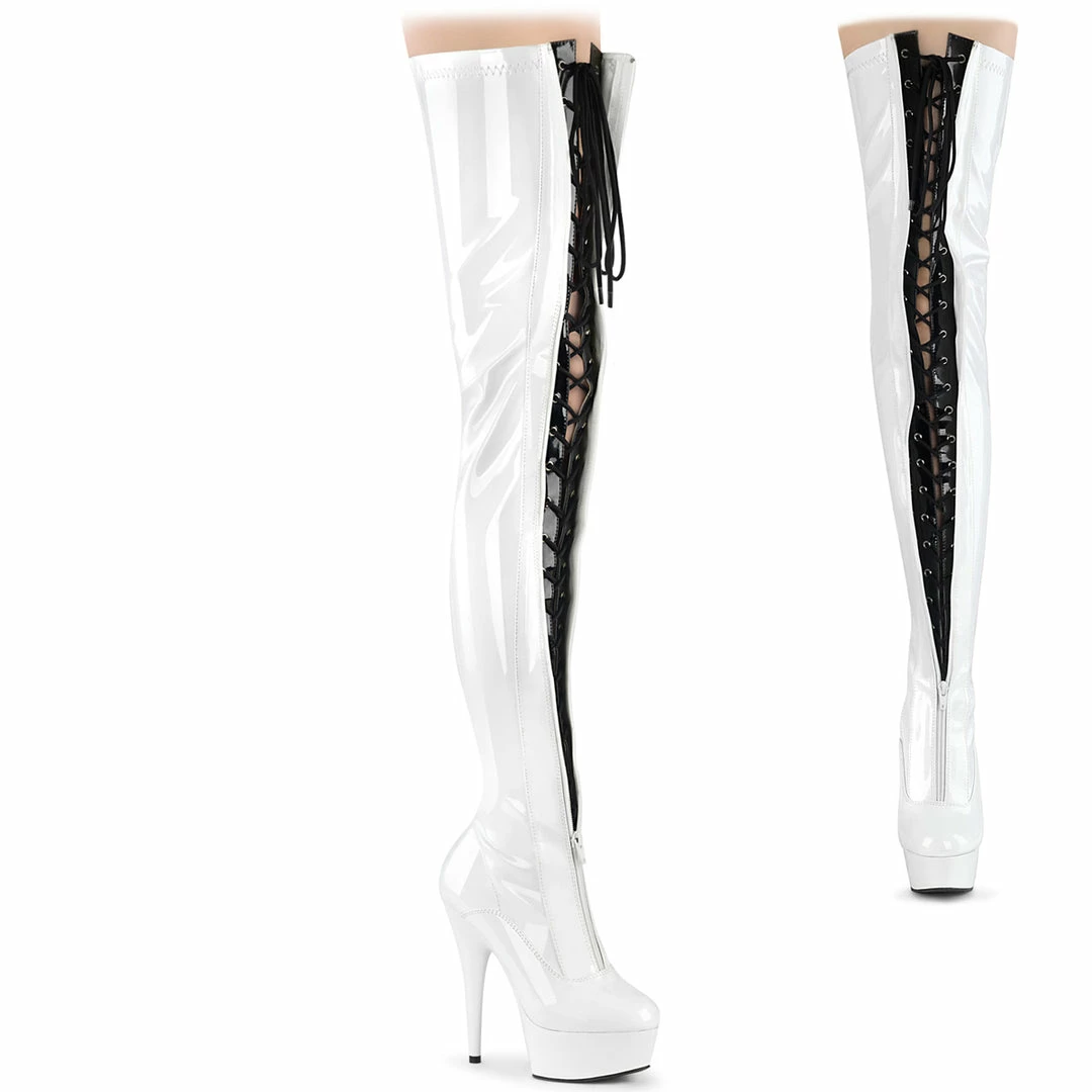 6″ (15.2cm) heel, 1/3/4″ (4.5cm) platform two tone lace-up/zip-up stretch thigh high boot with full length front zip and 10″ back zip closure.