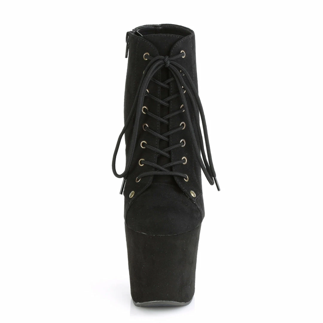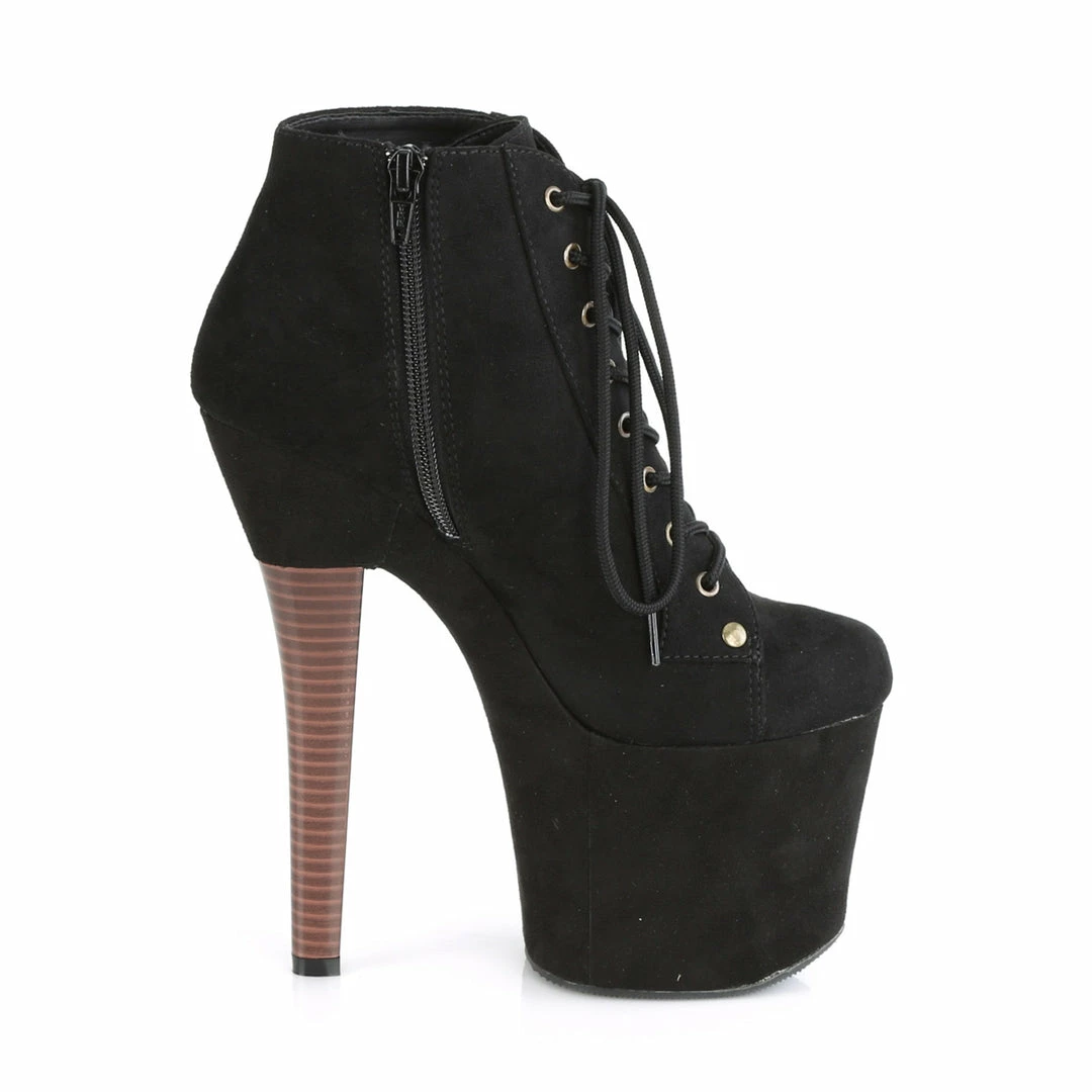 7″ (17.8cm) heel, 3 1/4″ (8.3cm) platform lace-up front ankle bootie featuring full wrapped platform bottom and stacked heel with inside zip closure.
