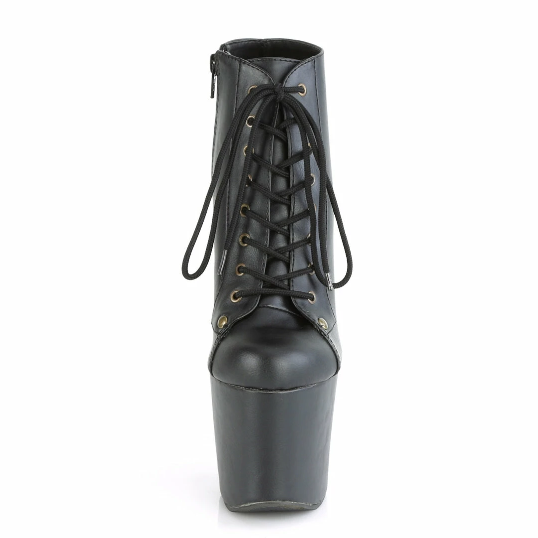 7″ (17.8cm) heel, 3 1/4″ (8.3cm)Β platform lace-up front ankle bootie featuring full wrapped platform bottom and stacked heel with inside zip closure.
