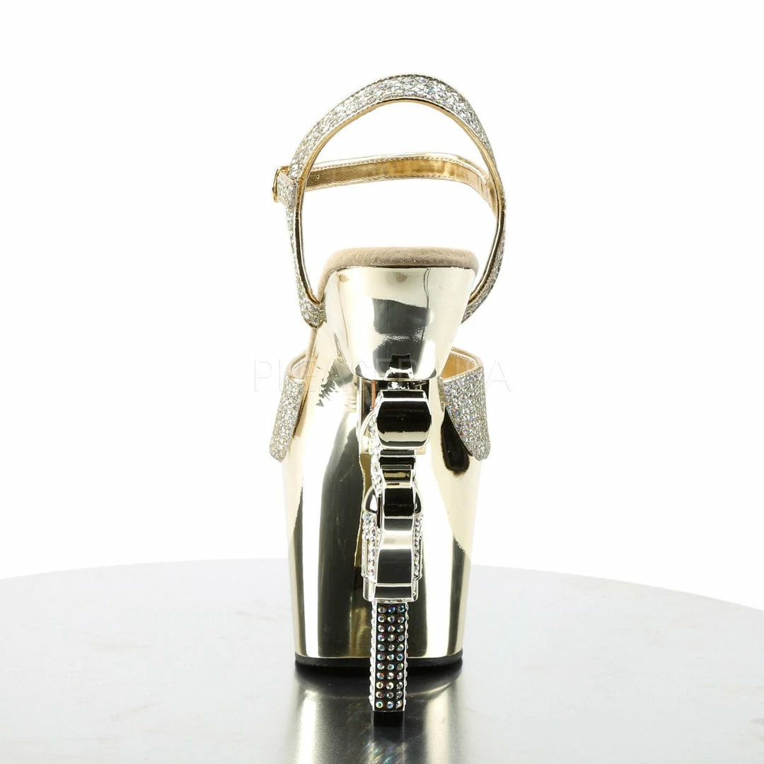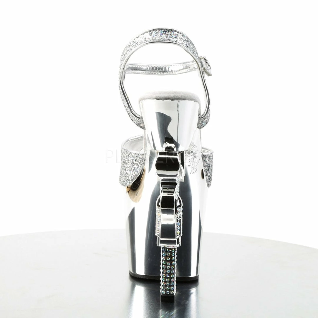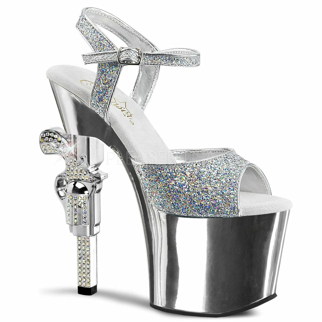 7″ (17.8cm) Rhinestone embellished gun heel, 3 1/4″ (8.3cm) chrome plated platform ankle strap sandal.