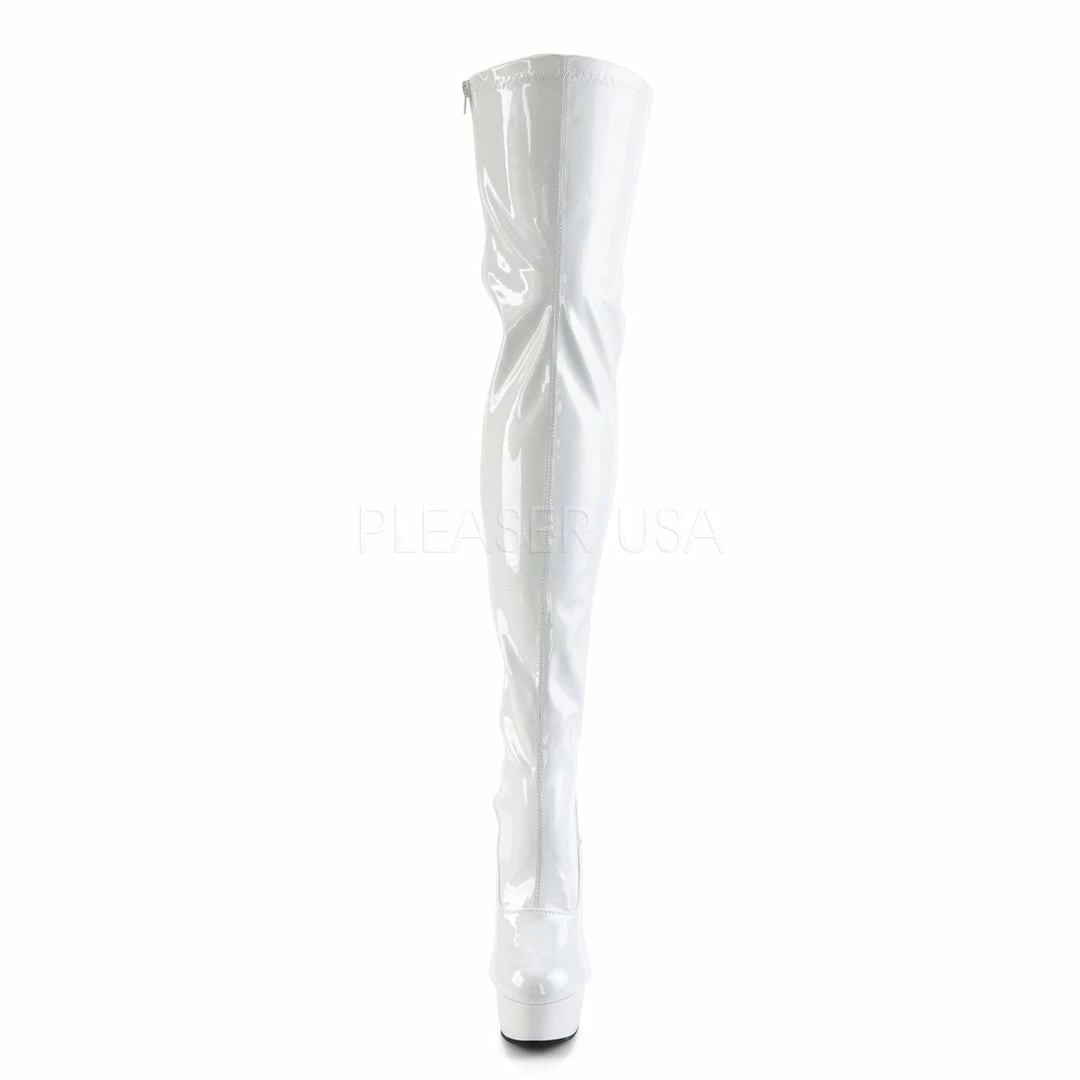 6″ (15.2cm) heel, 1/3/4″ (4.5cm) platform back lace-up stretch thigh high boot, full inner side zipper.