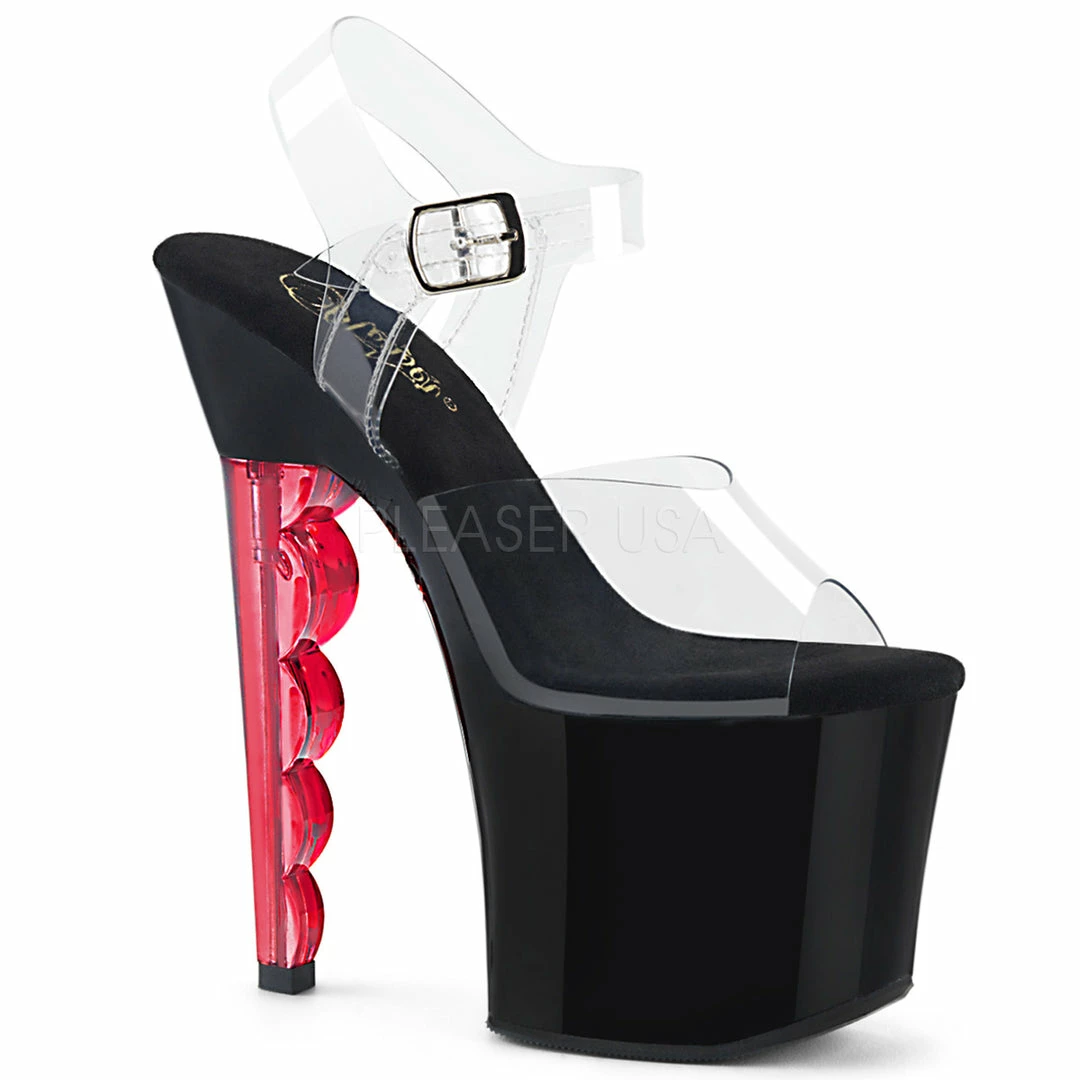 7″ (17.8cm) Scalloped heel, 3 1/4″ (8.3cm) platform ankle strap sandal.