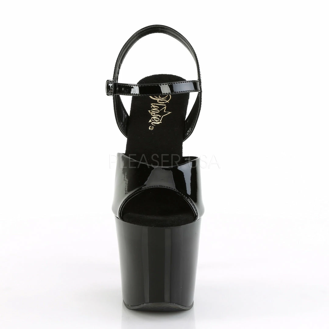 7″ (17.8cm) heel, 3 1/4″ (8.3cm) platform two tone ankle strap sandal with chrome plated scalloped heel.
