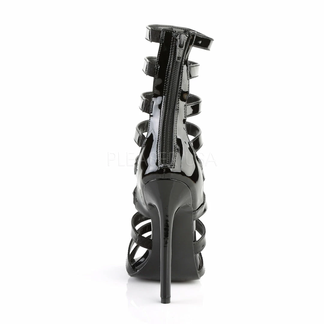 5″ (12.7cm) stiletto heel closed back strappy cage sandal, back zipper.