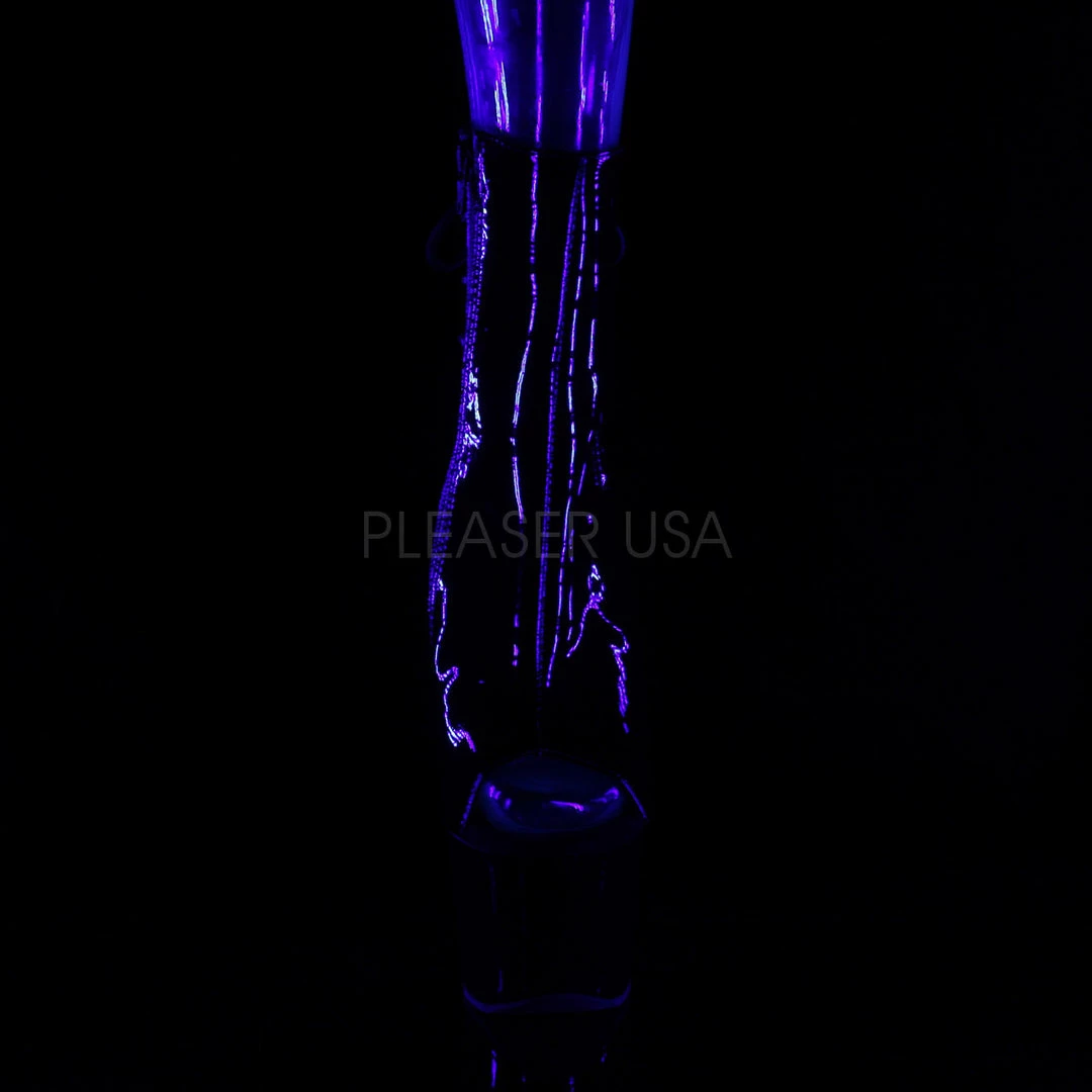 7″ (17.8cm) heel, 2 3/4″ (7cm) platform open toe/heel, back lace up two tone ankle boot with hidden zip pocket featuring blacklight sensitive contrast color inner side of heel and underside of platform bottom. Inside zip closure.