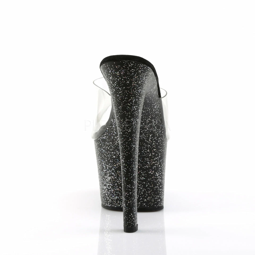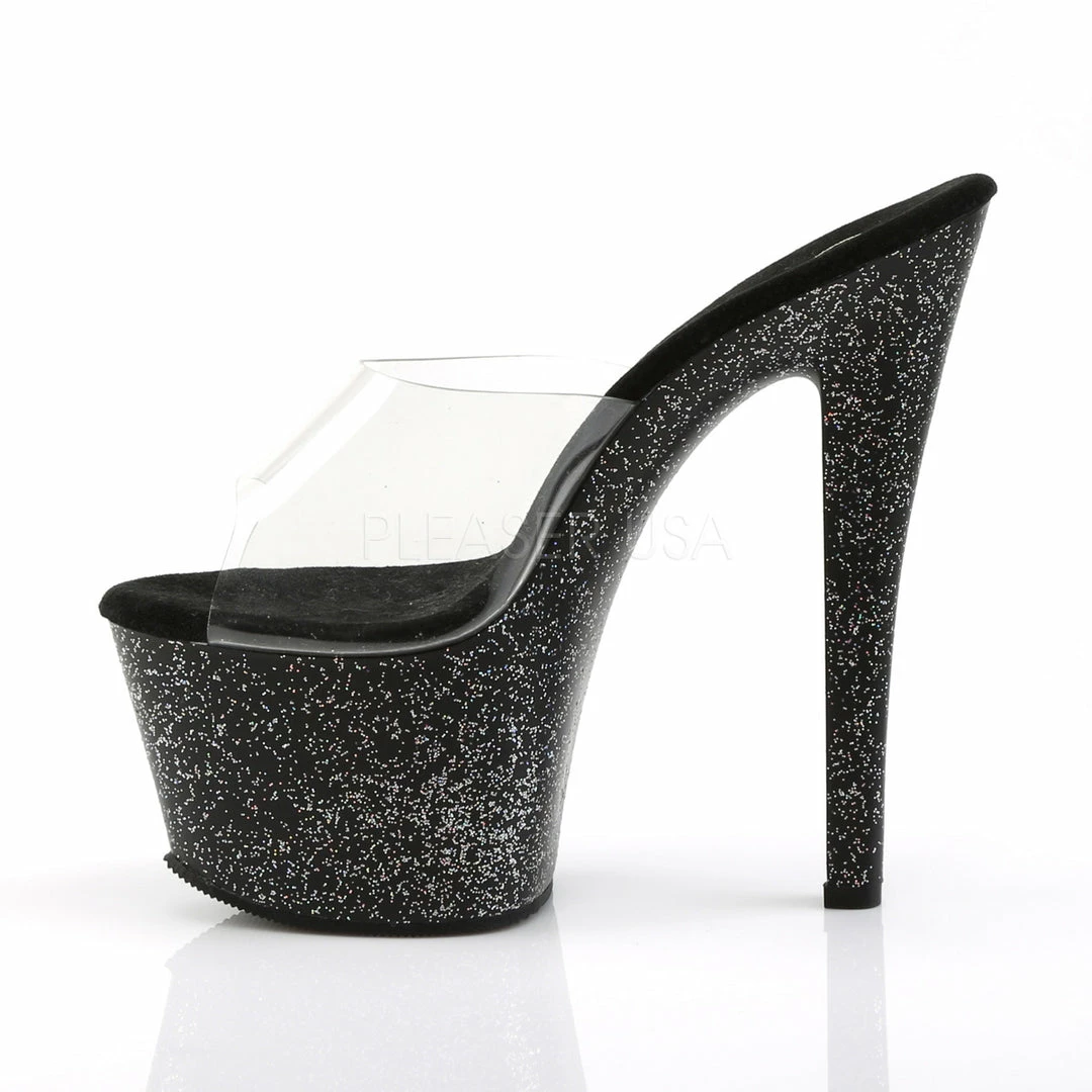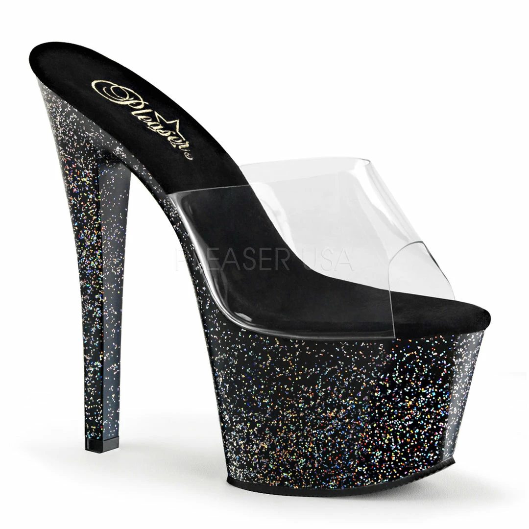 7″ (17.8cm) heel, 2 3/4″ (7cm) platform slide featuring mini iridescent glitter on entire bottom.