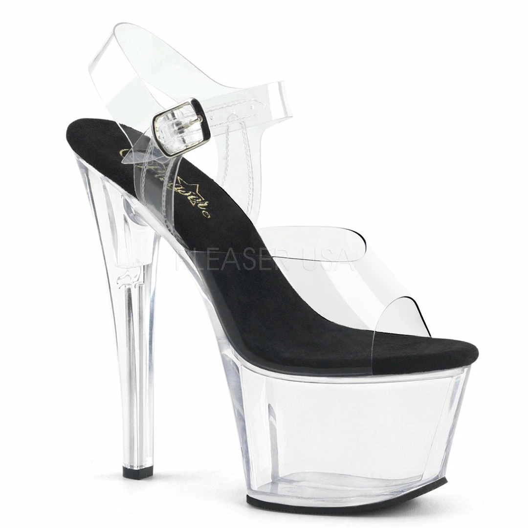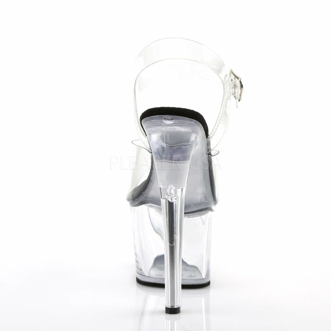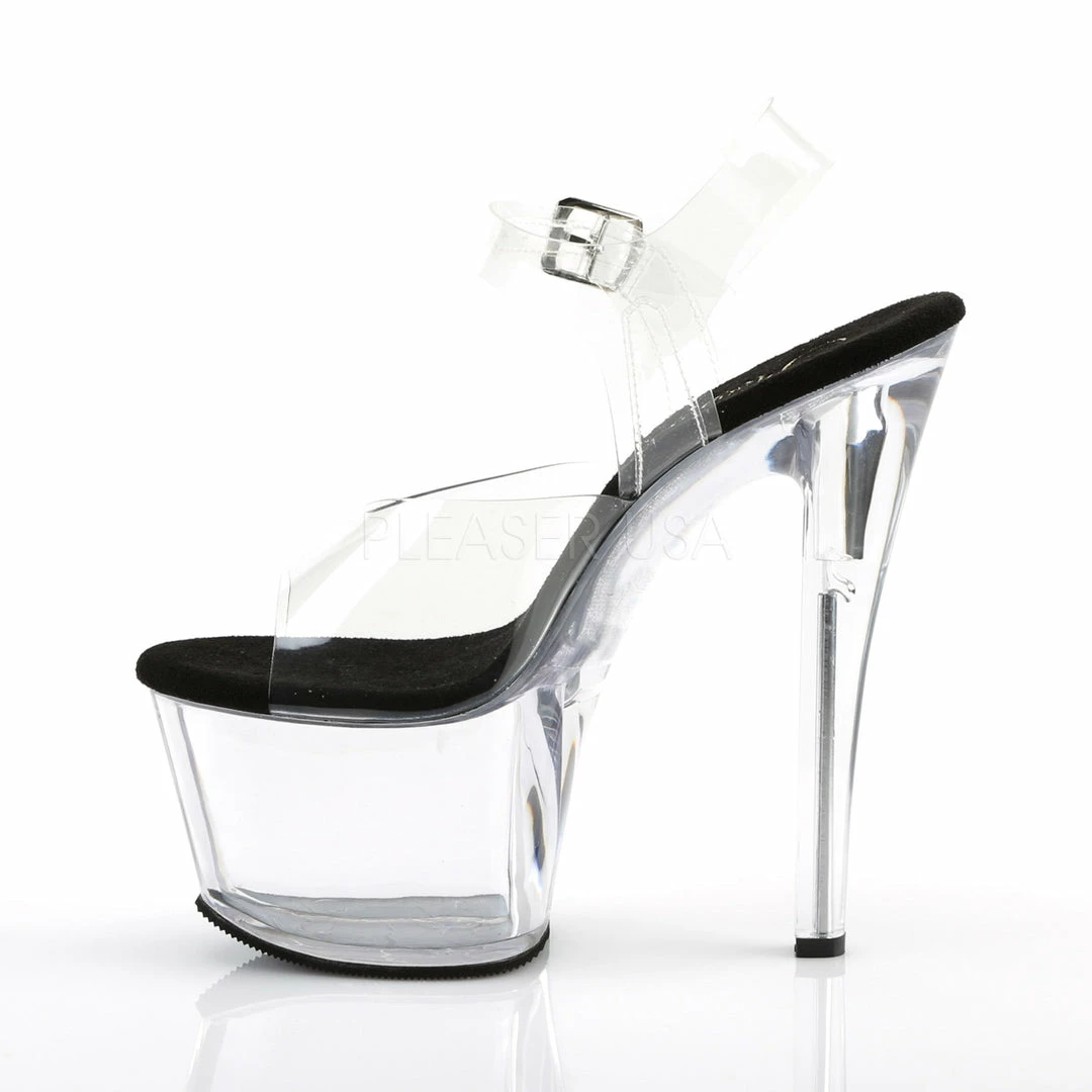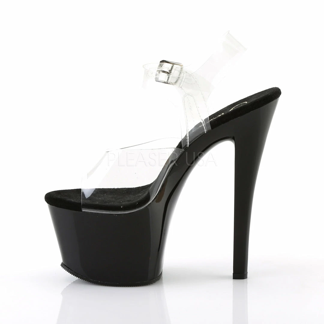 7″ (17.8cm) heel, 2 3/4″ (7cm) platform ankle strap sandal.