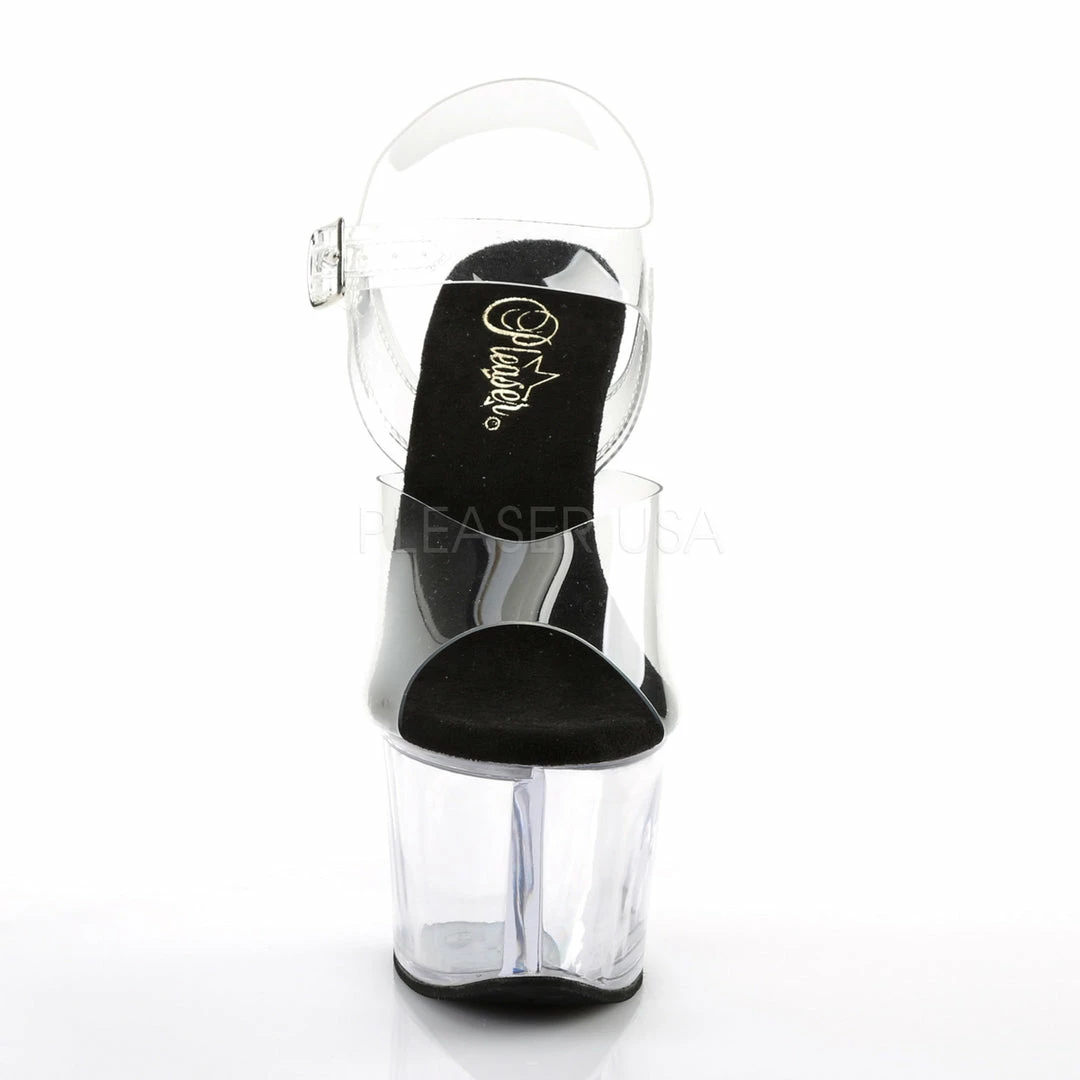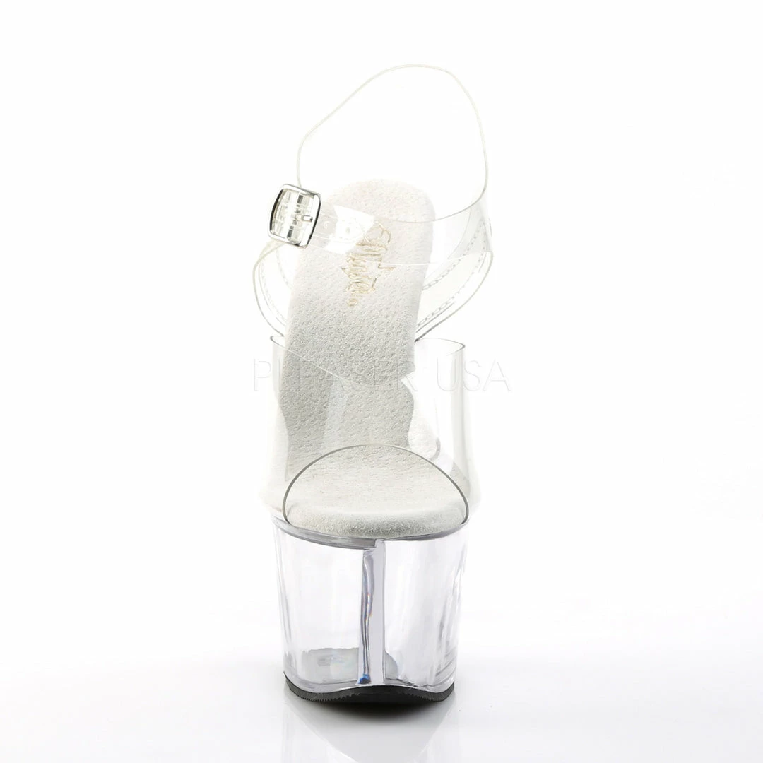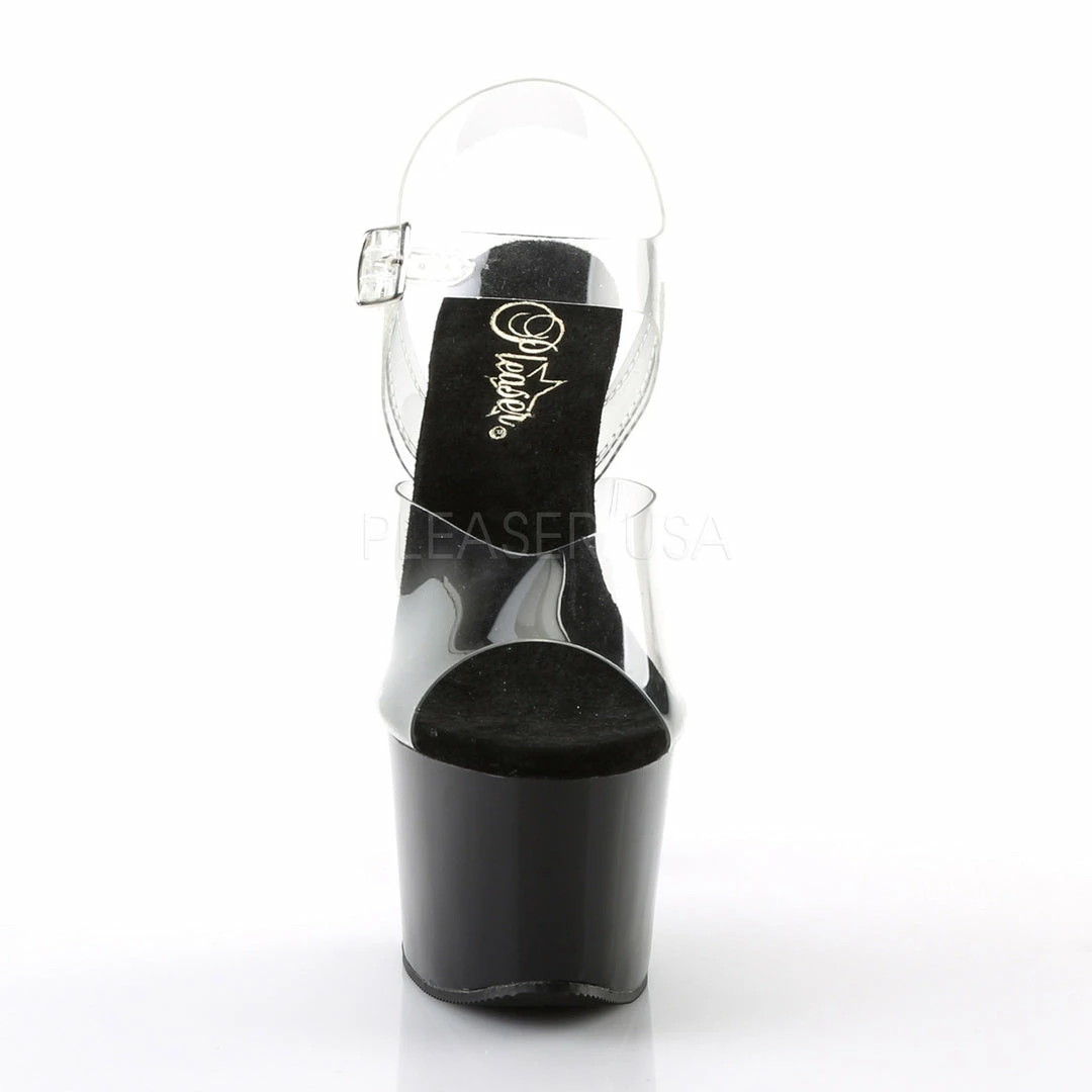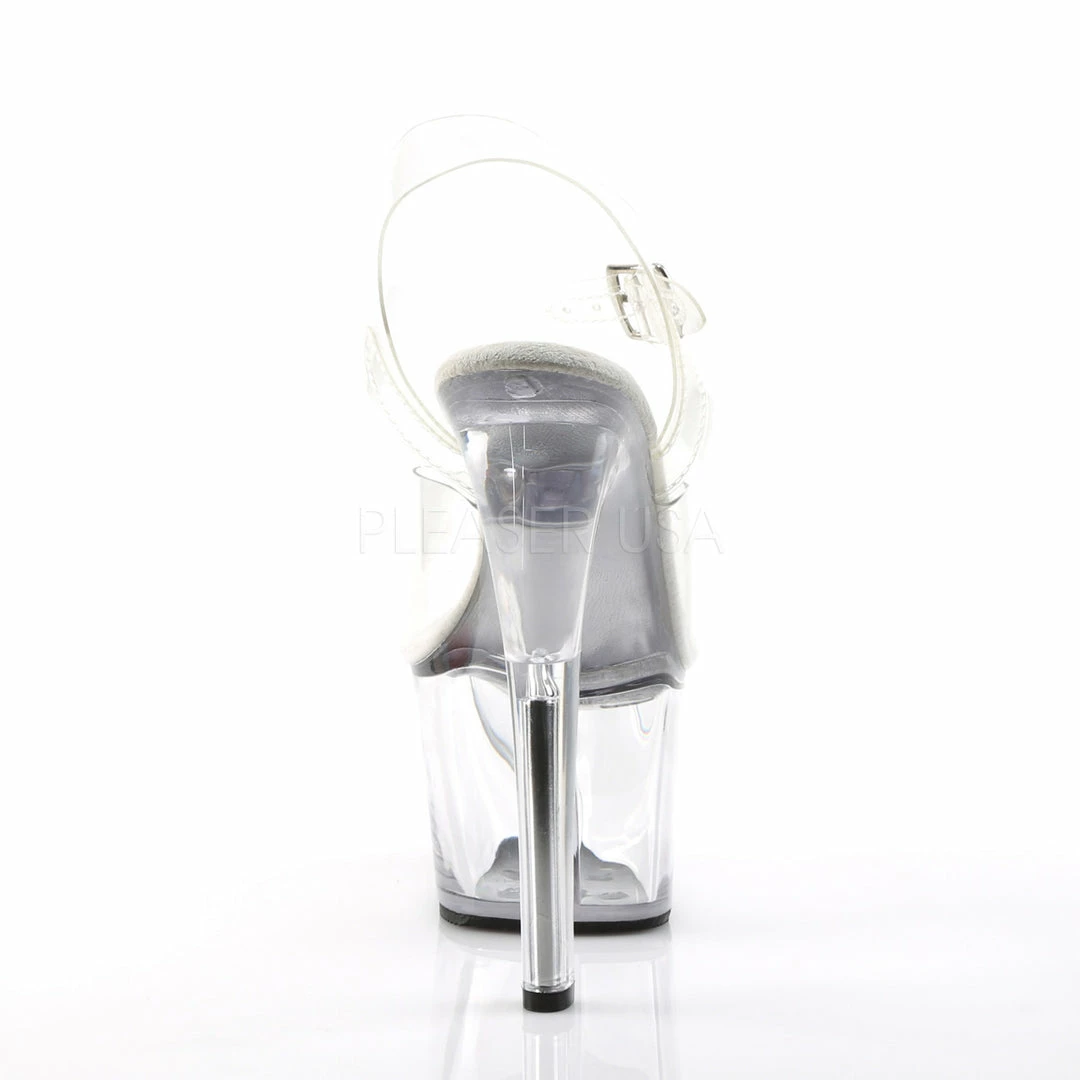 7″ (17.8cm) heel, 2 3/4″ (7cm) platform ankle strap sandal.