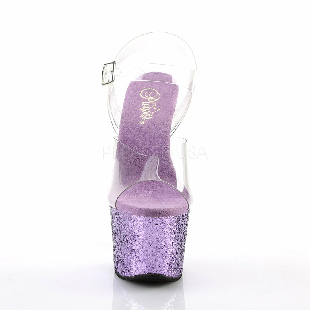 7″ (17.8cm) heel, 2 3/4″ (7cm)Β platform ankle strap sandal featuring holographic glitters on the entire platform bottom.