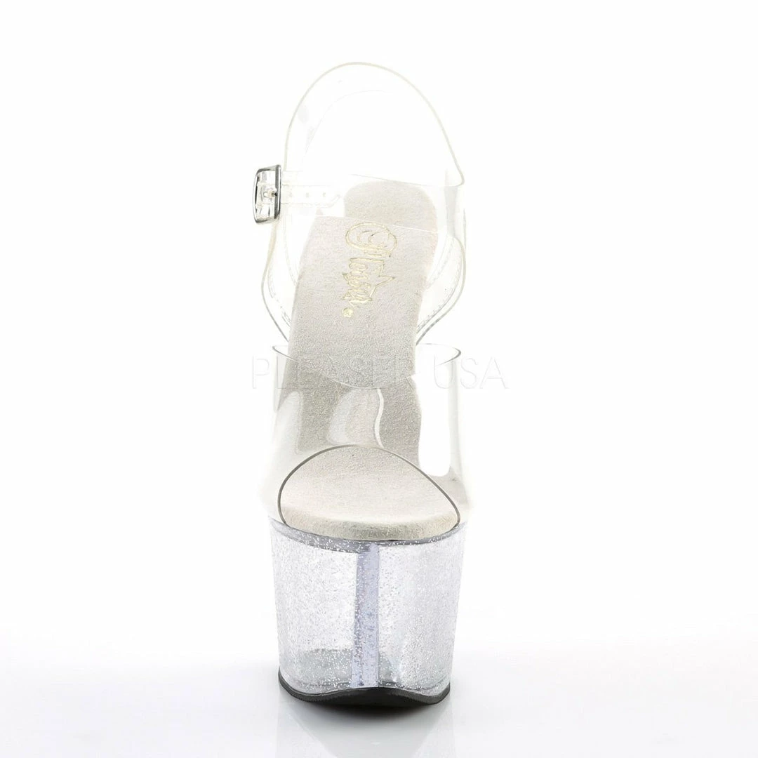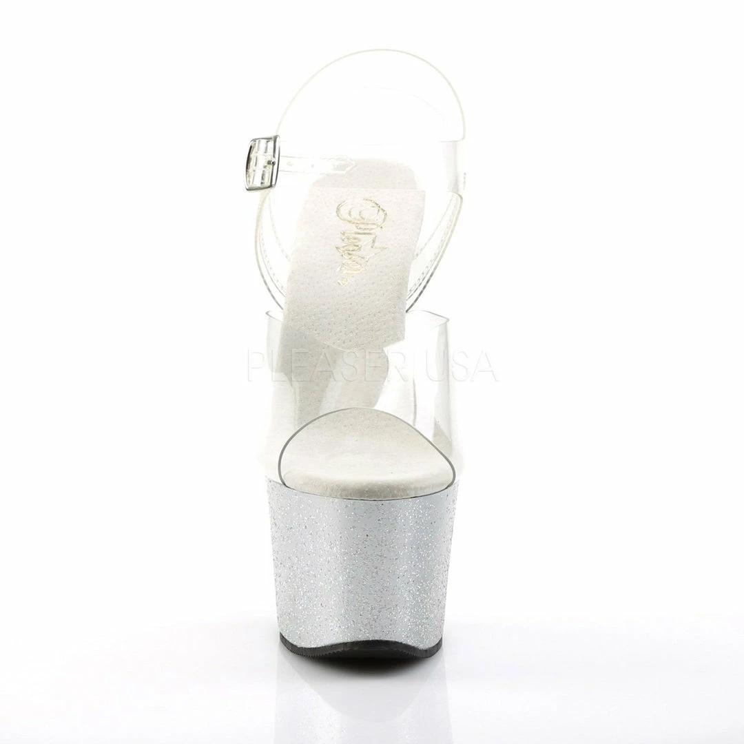 7″ (17.8cm) heel, 2 3/4″ (7cm) platform ankle strap sandal featuring mini iridescent glitters on entire platform bottom.