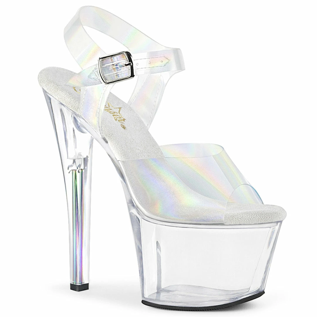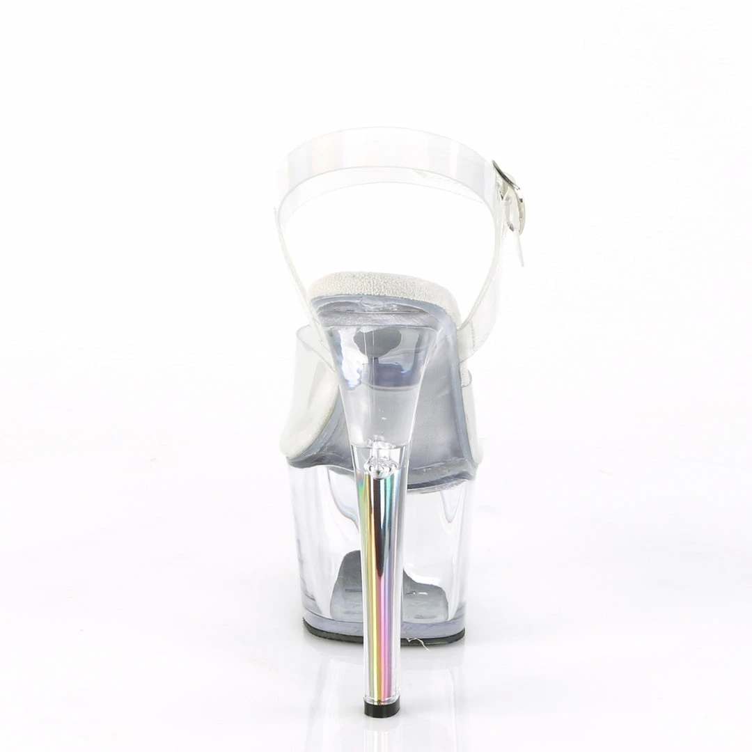 7″ (17.8cm) heel, 2 3/4″ (7cm) platform ankle strap sandal featuring rainbow plated steel tubing inside heel.