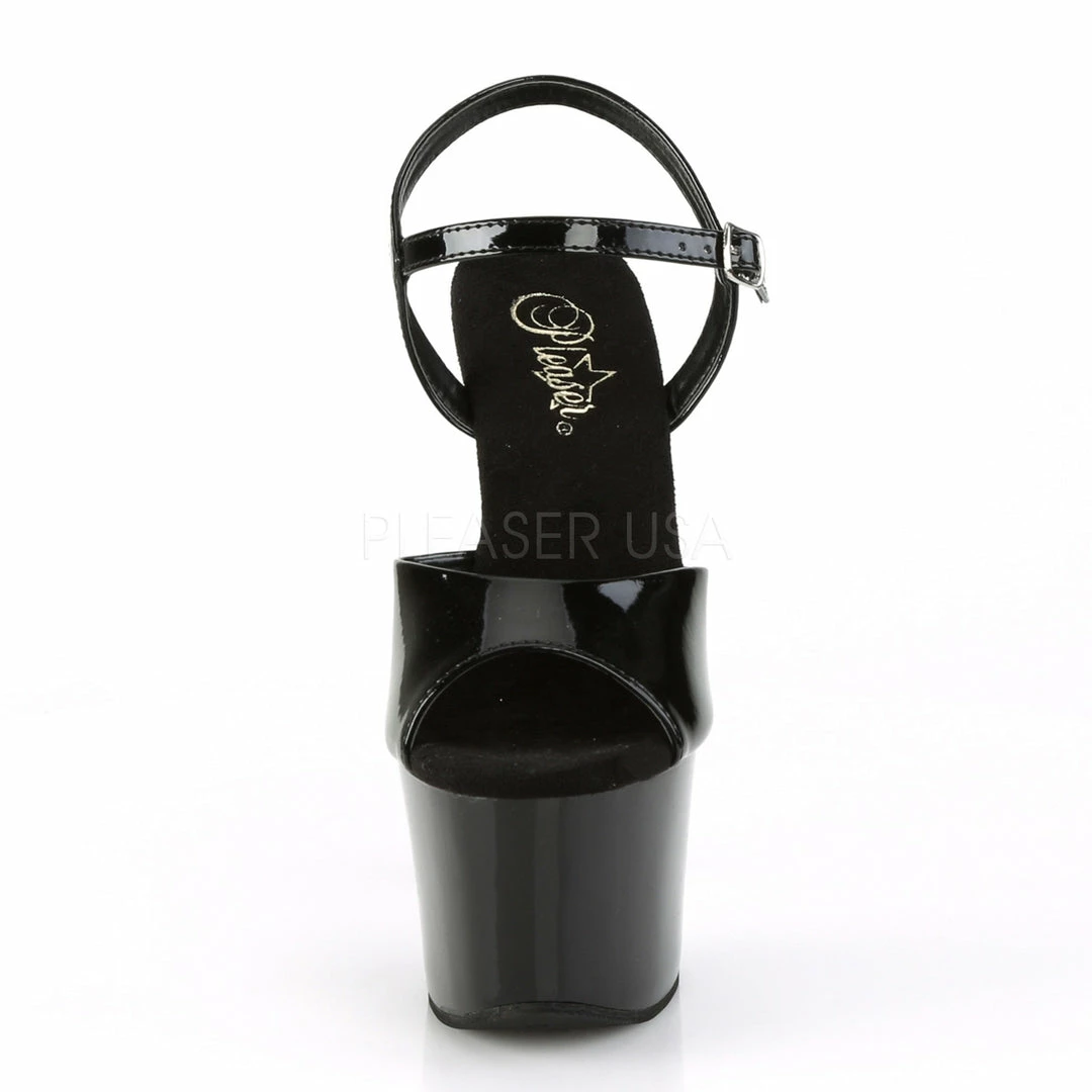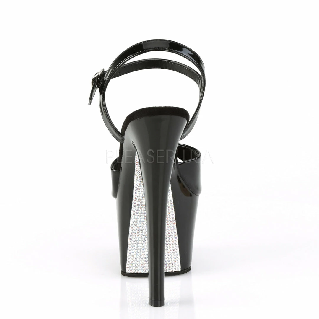 7″ (17.8cm) heel, 2 3/4″ (7cm) platform ankle strap with contrast rhinestones on platform bottom.