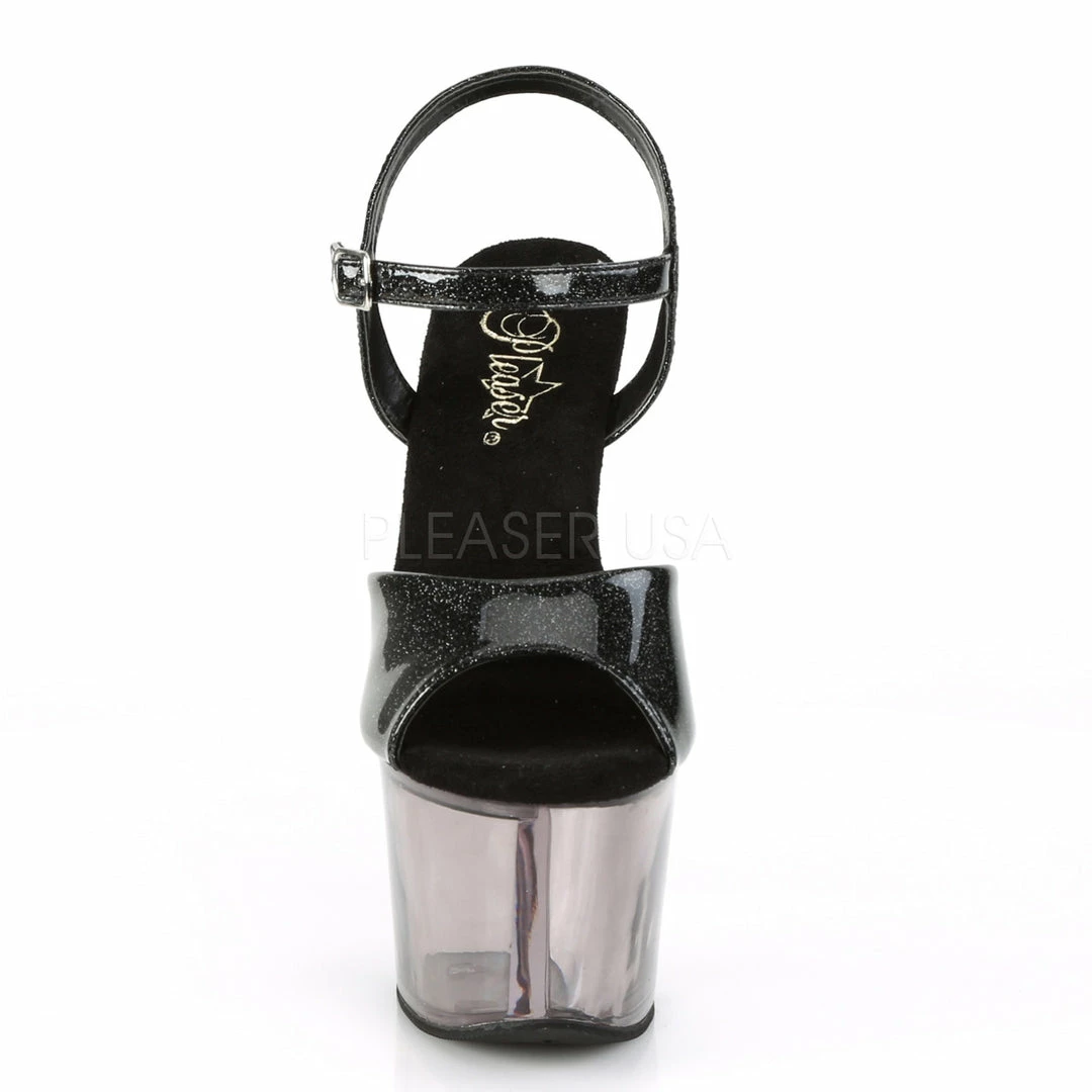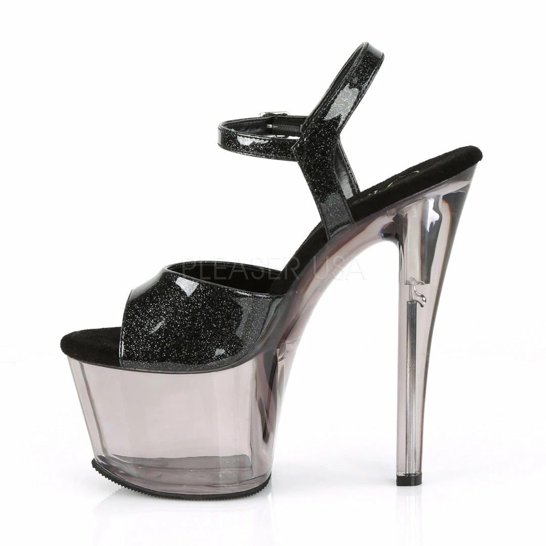 7″ (17.8cm) heel, 2 3/4″ (7cm) tinted platform ankle strap sandal.