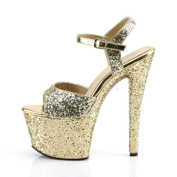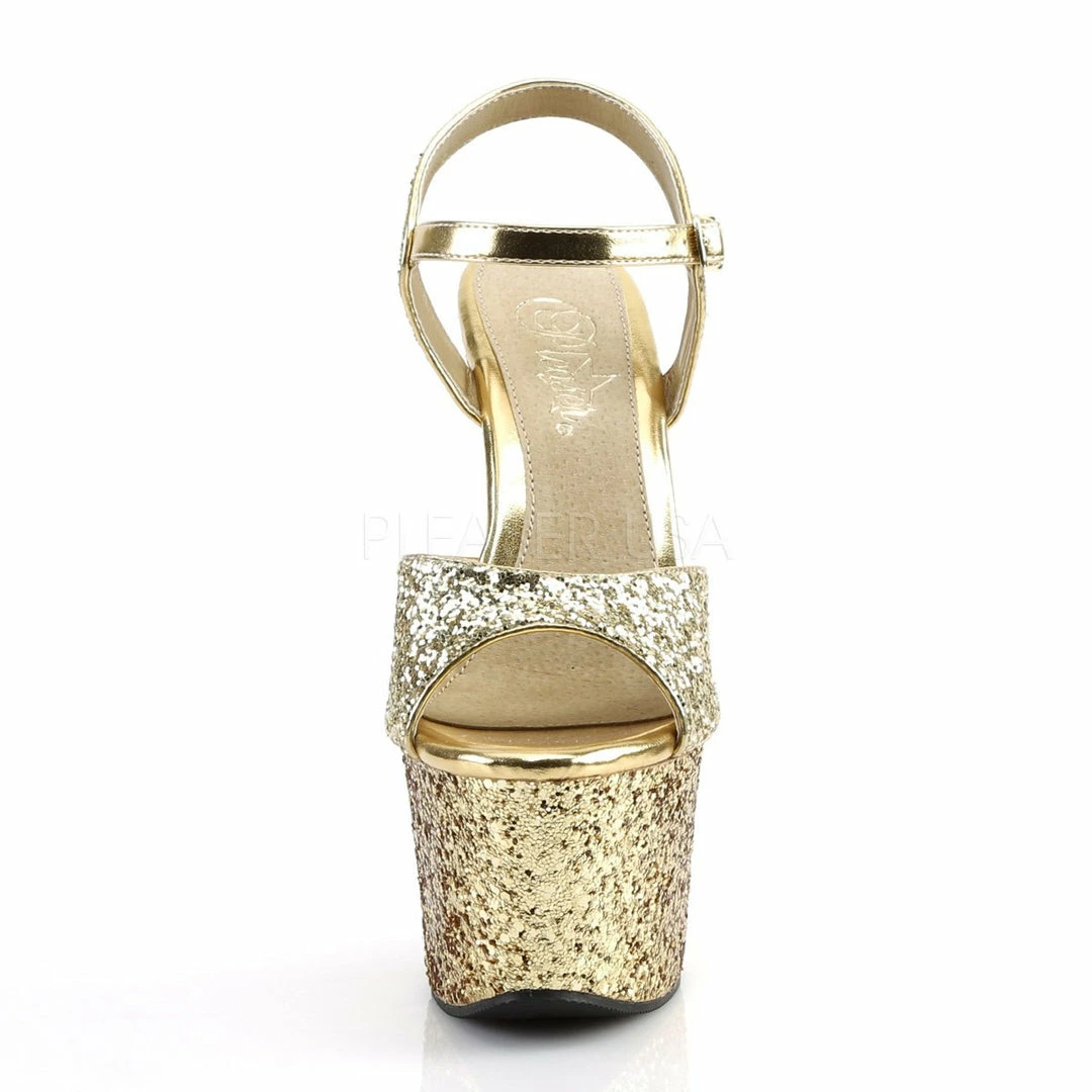 7″ (17.8cm) heel, 2 3/4″ (7cm)Β platform ankle strap sandal with matching glitter upper and platform bottom.
