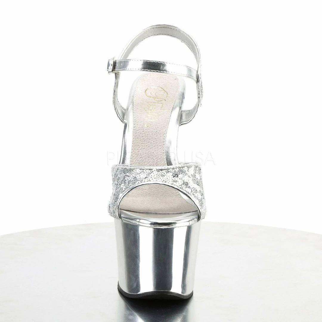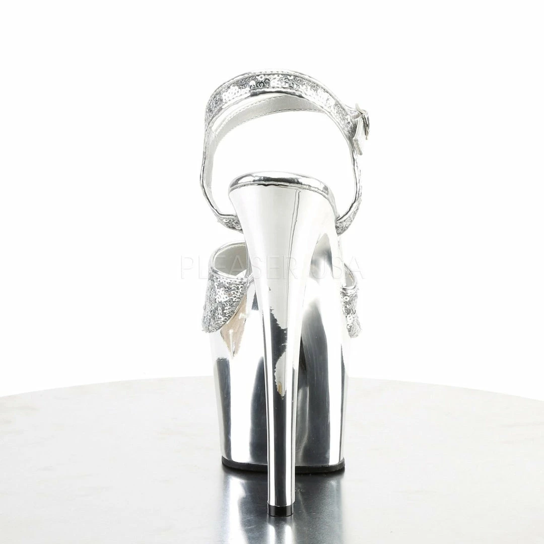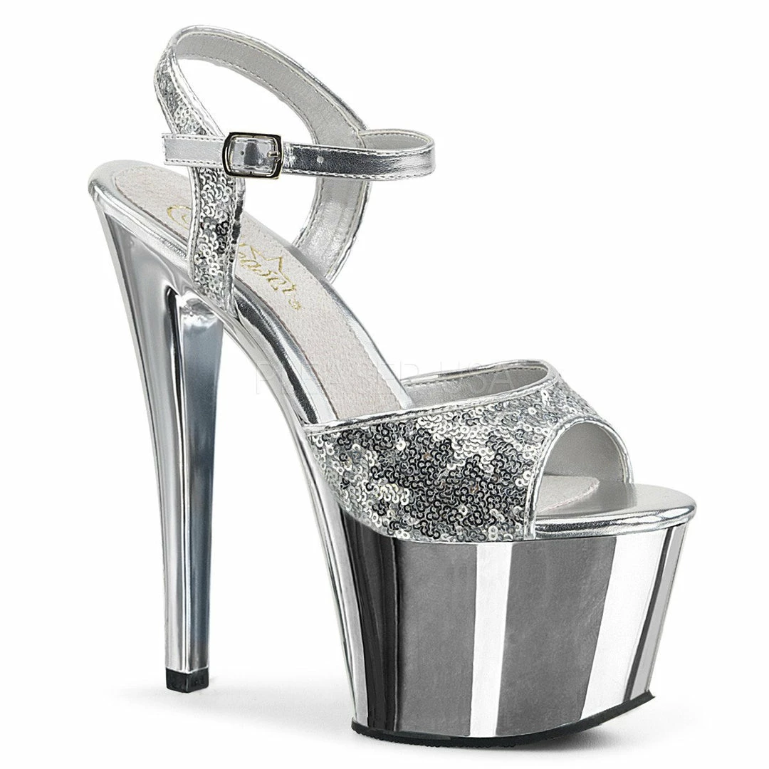7″ (17.8cm) heel, 2 3/4″ (7cm) Chrome platform ankle strap sandal.