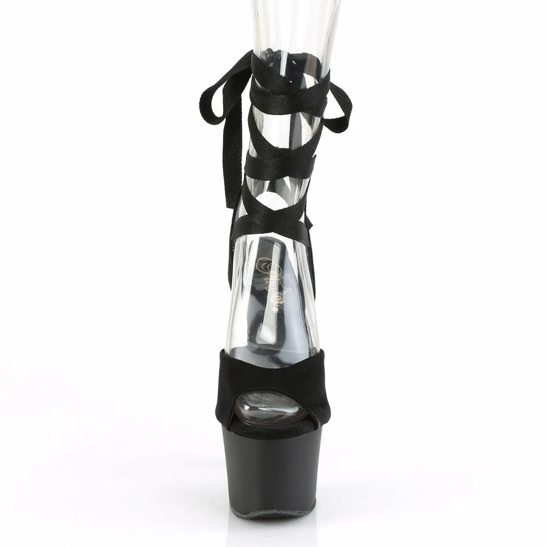 7″ (17.8cm) heel, 2 3/4″ (7cm) platform criss cross ankle wrap sandal.