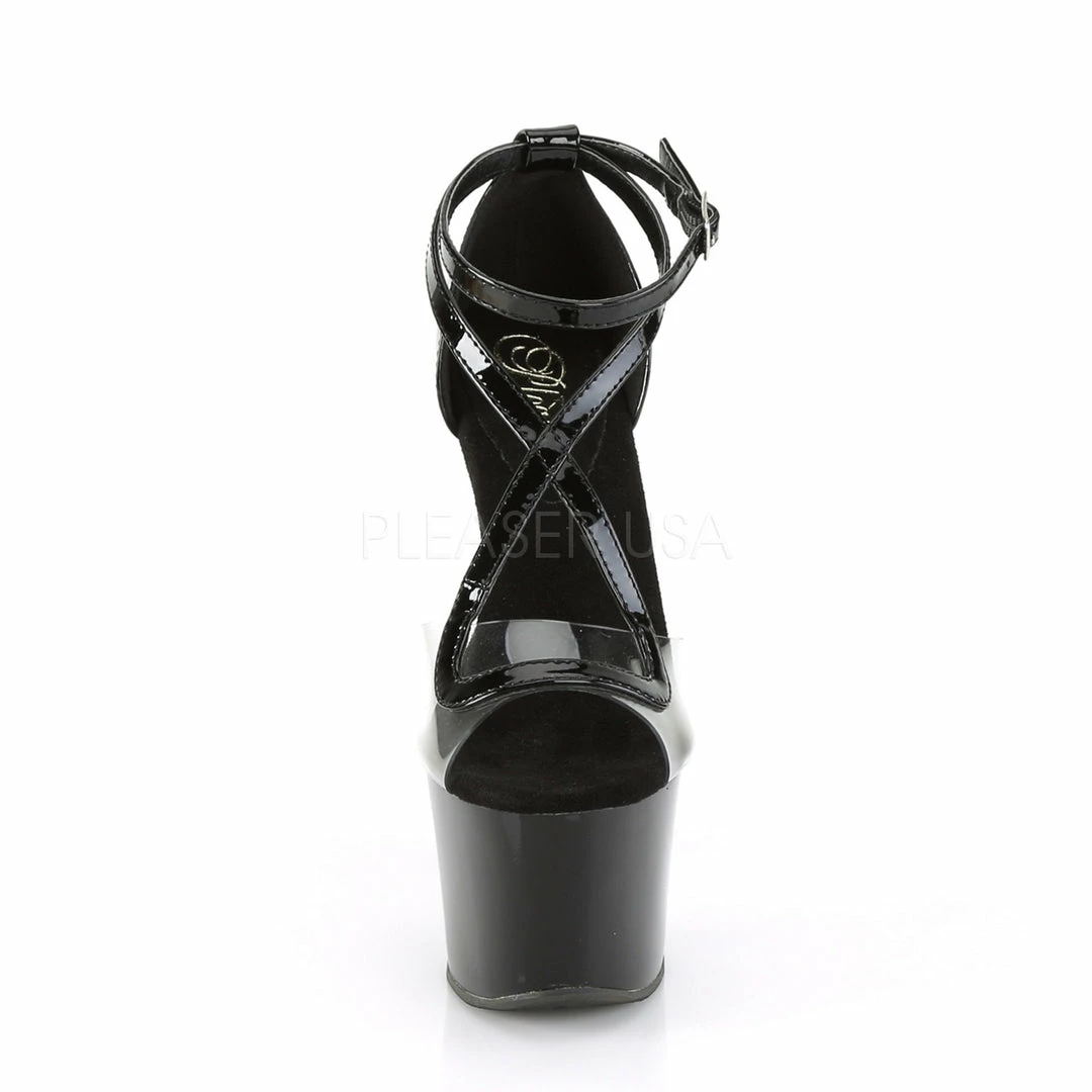7″ (17.8cm) heel, 2 3/4″ (7cm) platform criss-cross d’Orsay sandal.