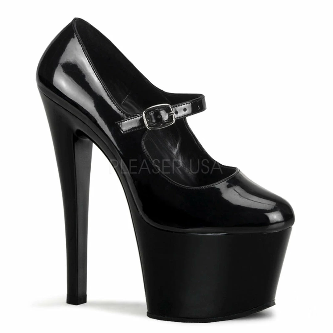 7″ (17.8cm) heel, 2 3/4″ (7cm) Mary Jane platform pump.