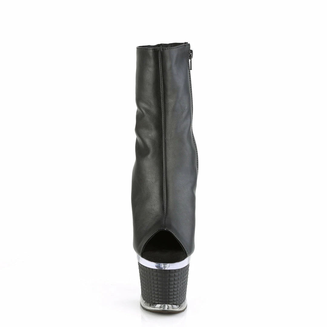 7″ (17.8cm) heel, 3″ (7.6cm) Textured platform peep toe ankle boot with inside zip closure.