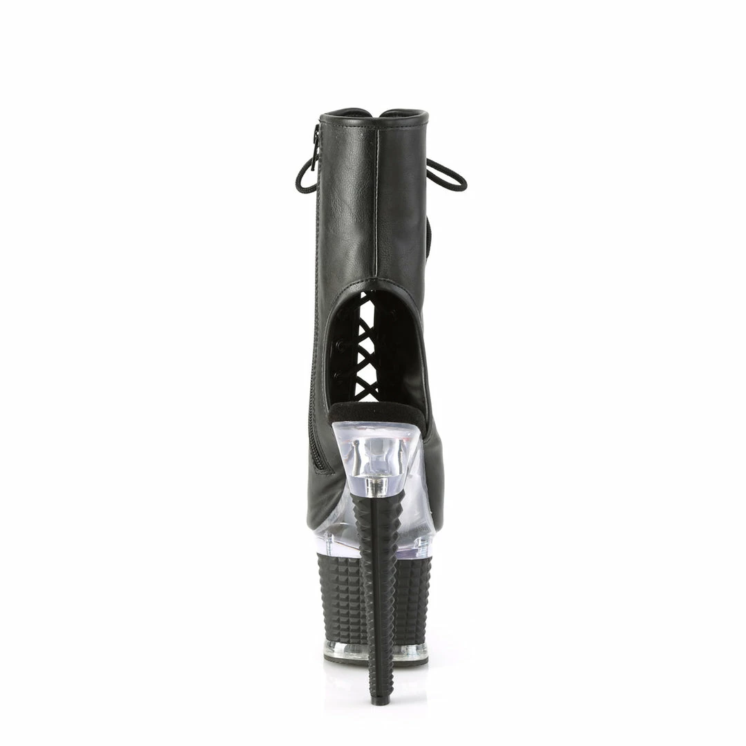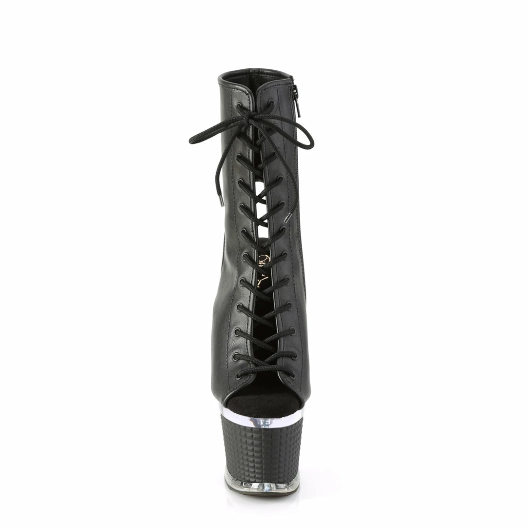 7″ (17.8cm) heel, 3″ (7.6cm) Textured platform open toe/heel,Β front lace-up ankle boot with insideΒ zip closure.