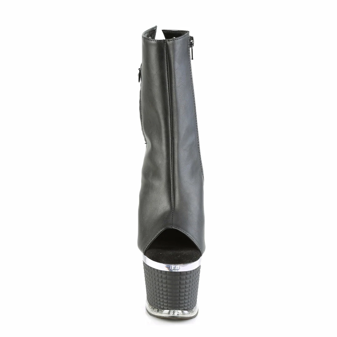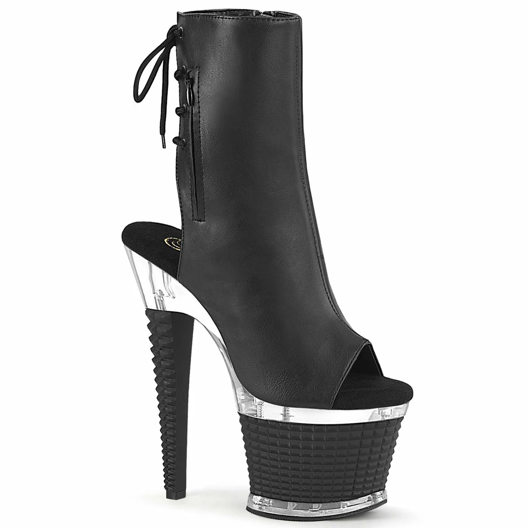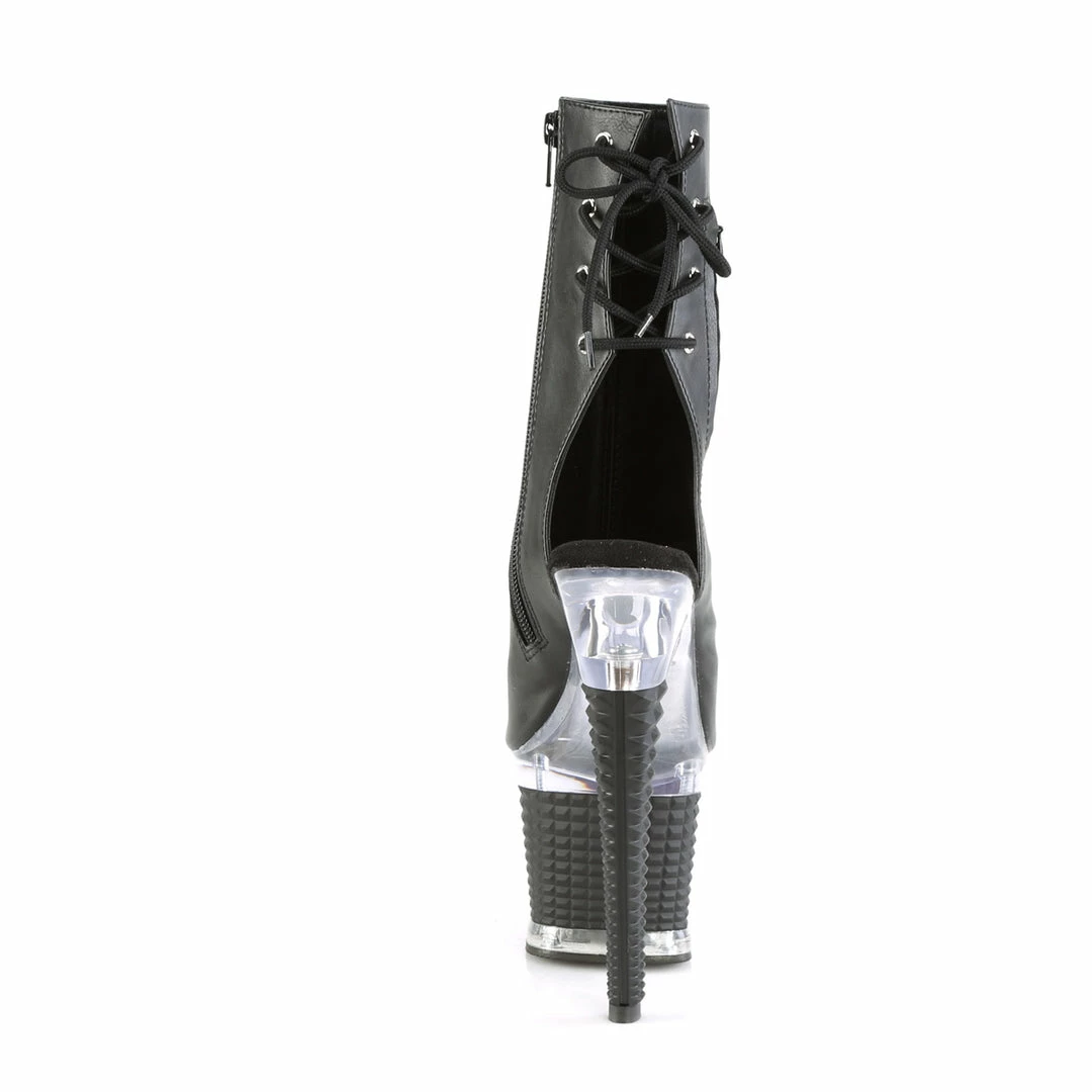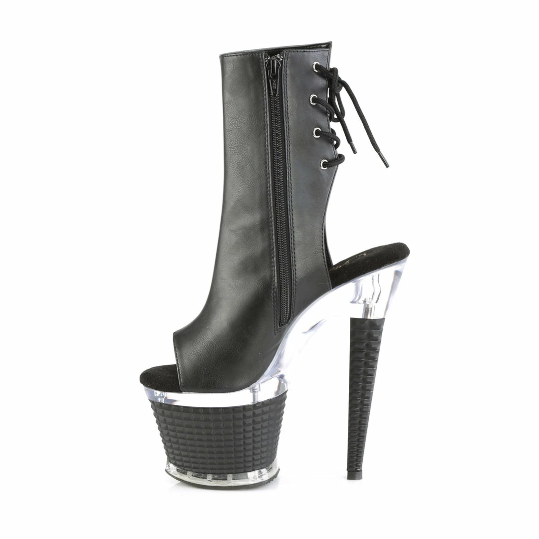 7″ (17.8cm) heel, 3″ (7.6cm) Textured platform open toe/heel, back lace-up ankle boot with hidden zip pocket and inside zip closure.