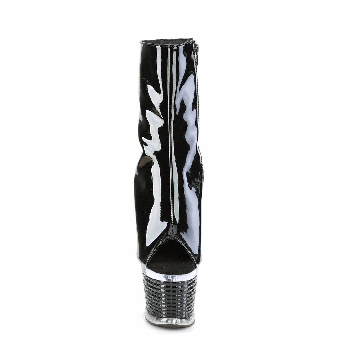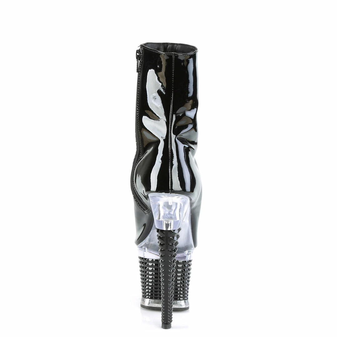 7″ (17.8cm) heel, 3″ (7.6cm) Textured platform open toe, front lace-up ankle boot with inside zip closure.