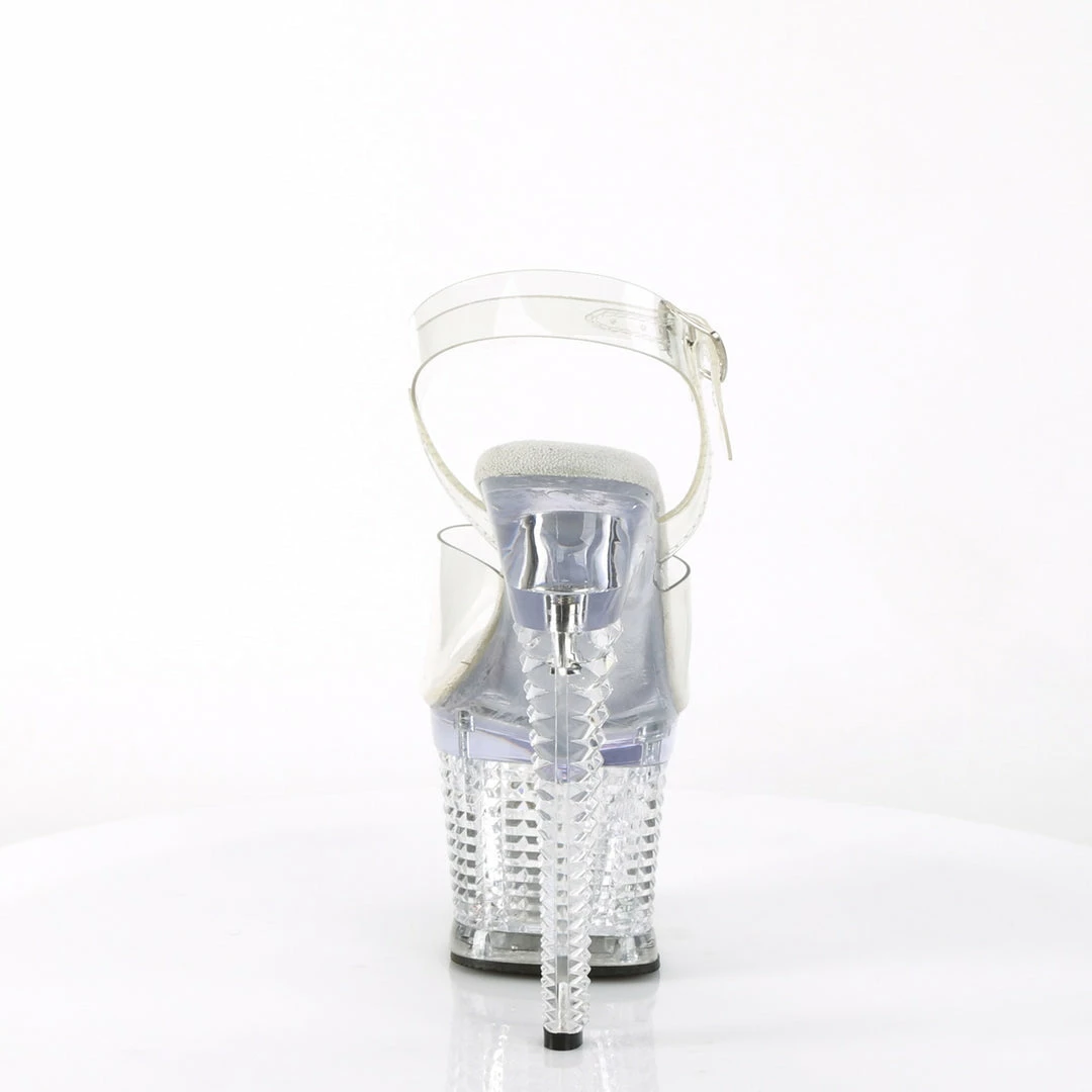 7″ (17.8cm) heel, 3″ (7.6cm) Textured platform ankle strap sandal.