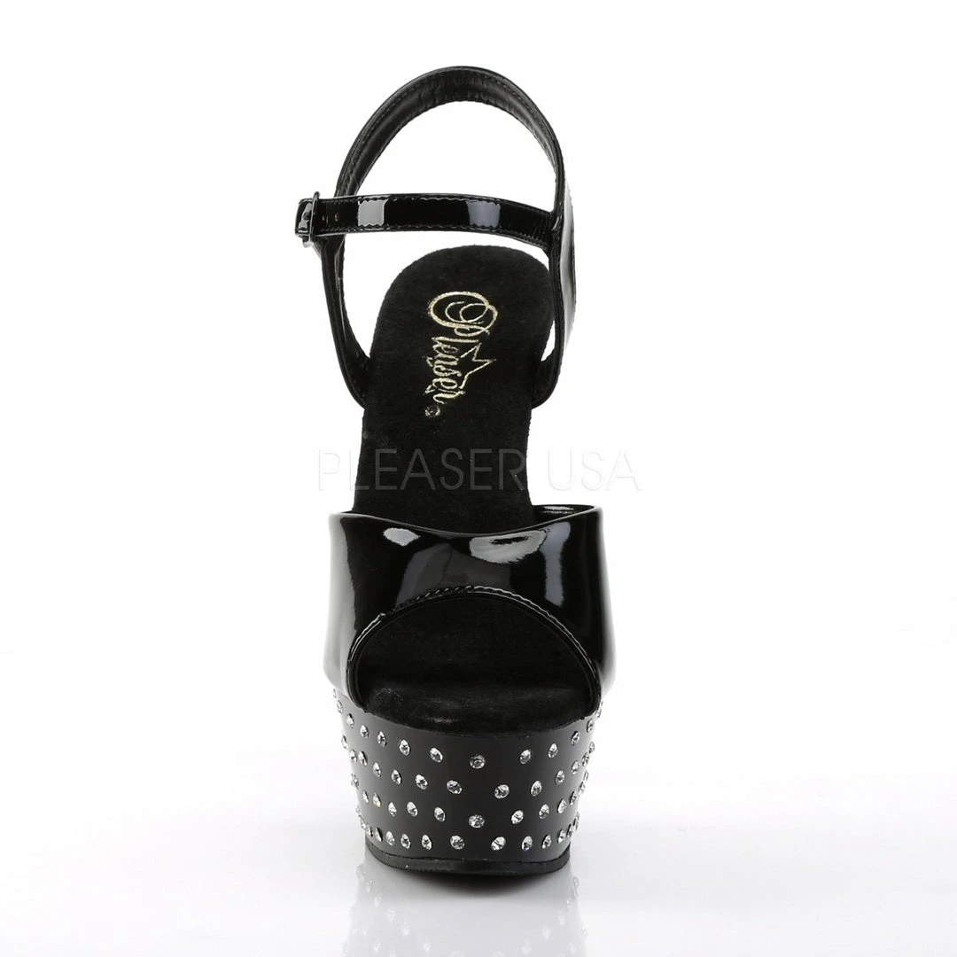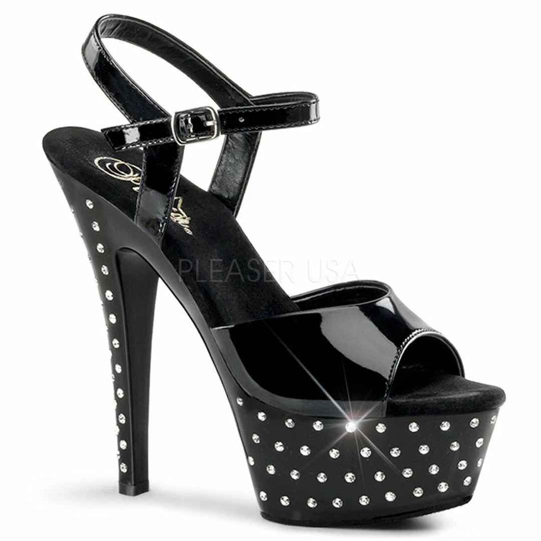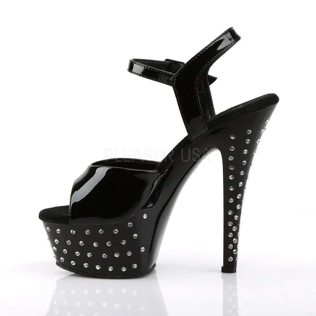 6″ (15.2cm) heel, 1/3/4″ (4.5cm) platform ankle strap sandal withΒ rhinestoneΒ studded platform.