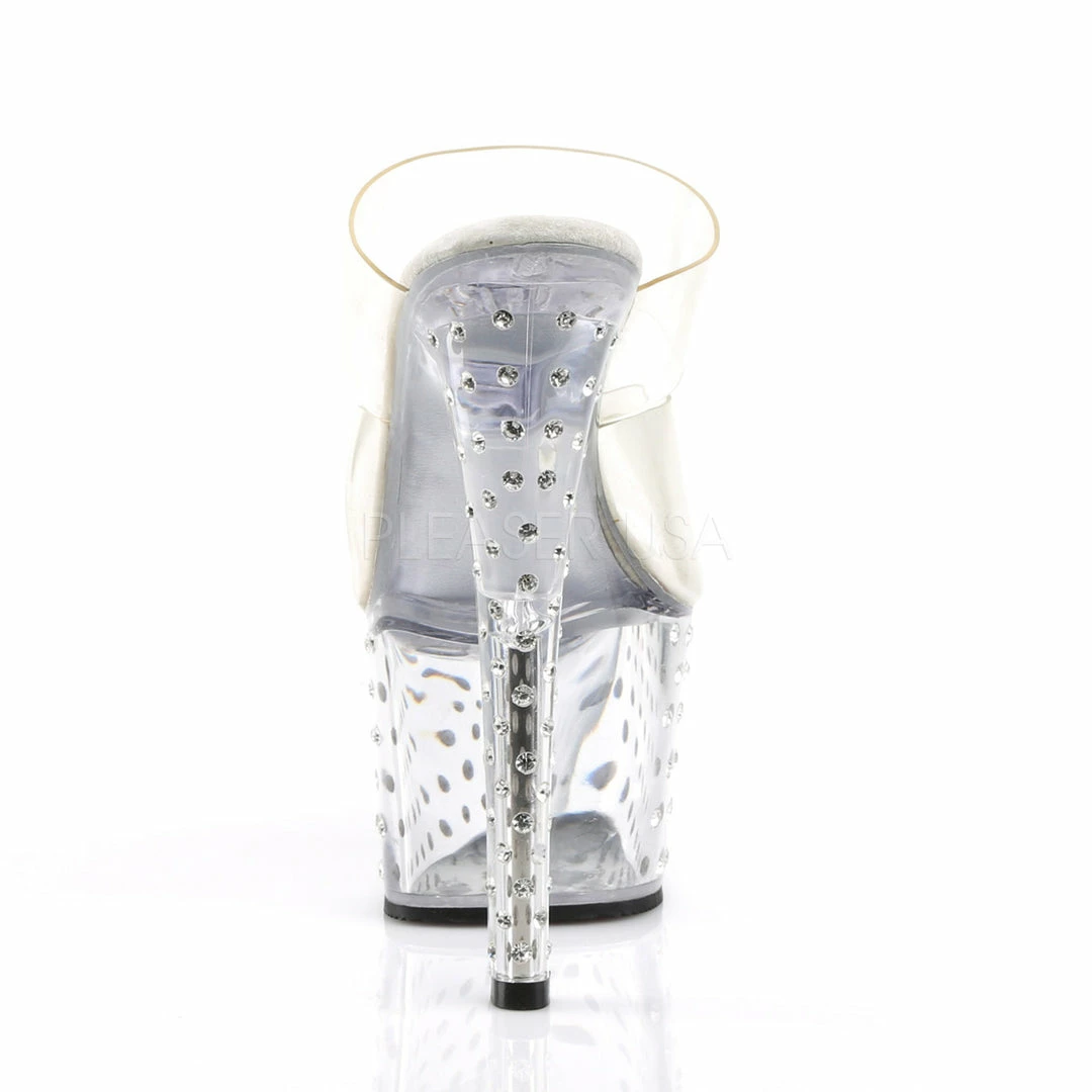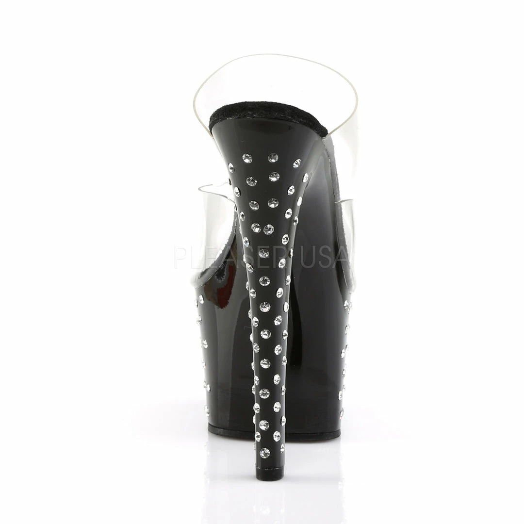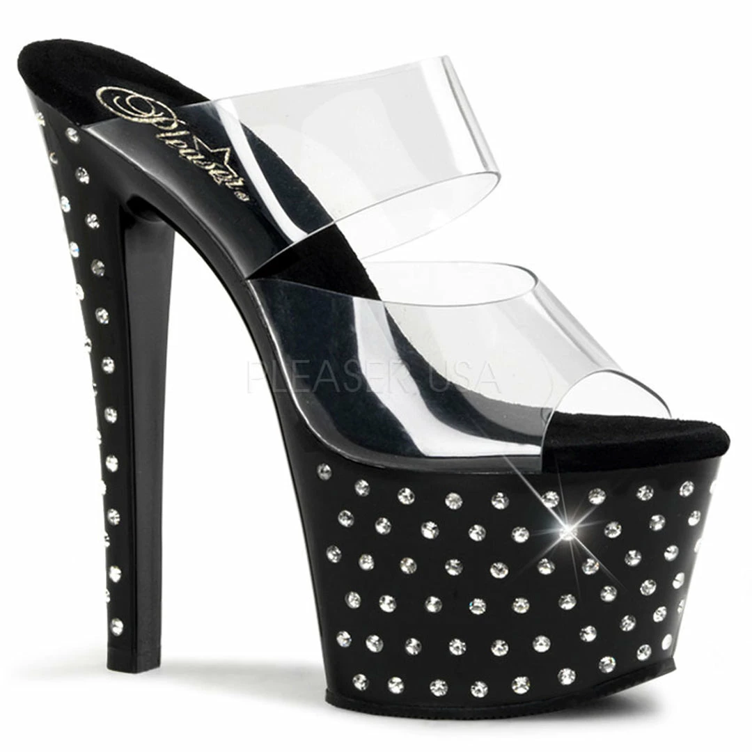 7″ (17.8cm) Heel, 2 3/4″ (7cm) platform two band slide featuring rhinestone studded bottom.