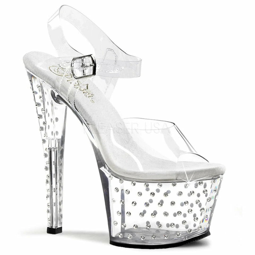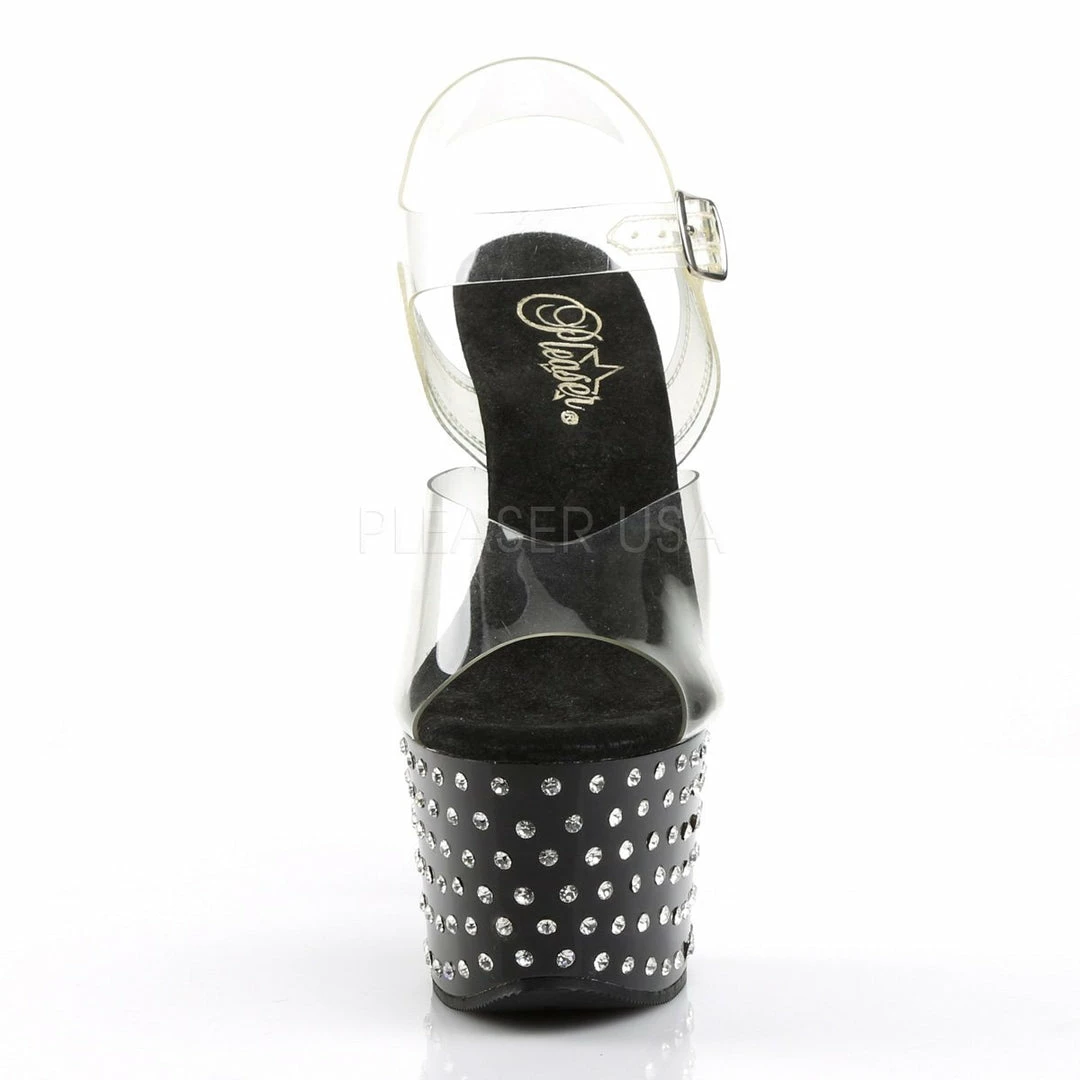 7″ (17.8cm) Heel, 2 3/4″ (7cm) platform ankle strap sandal featuring rhinestone studded bottom.