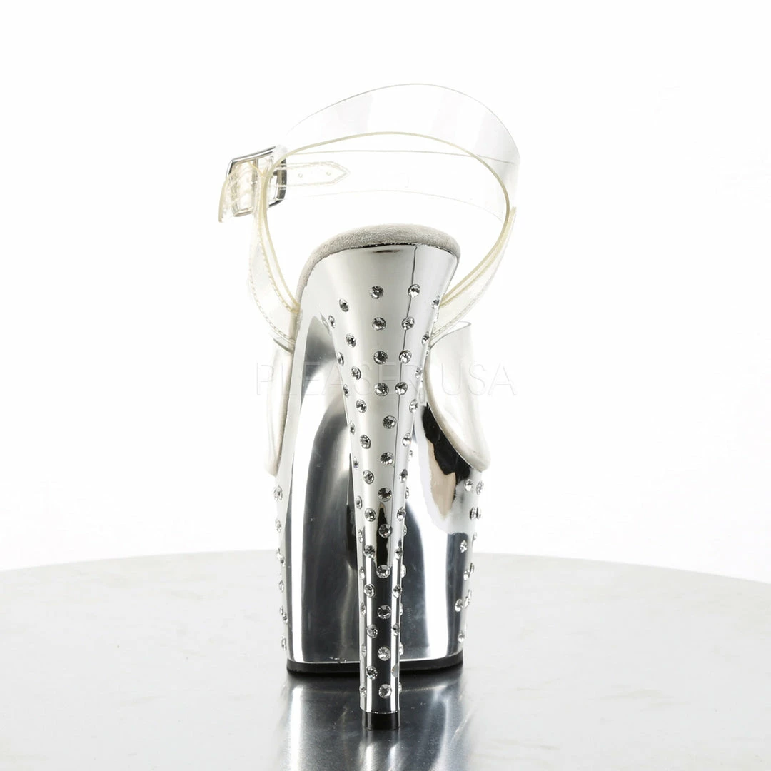 7″ (17.8cm) Heel, 2 3/4″ (7cm)ο»ΏΒ platform ankle strap sandal featuring rhinestone studded chrome bottom.