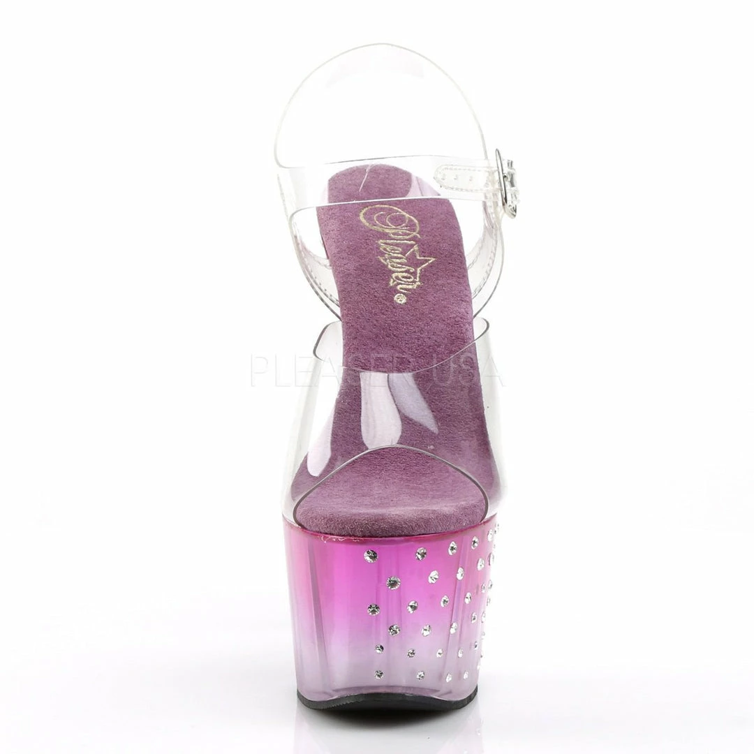 7″ (17.8cm) Heel, 2 3/4″ (7cm) platform ankle strap sandal featuring multi-size rhinestones studded on the outer side of the tinted platform bottom.