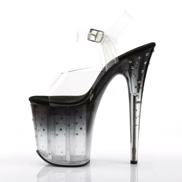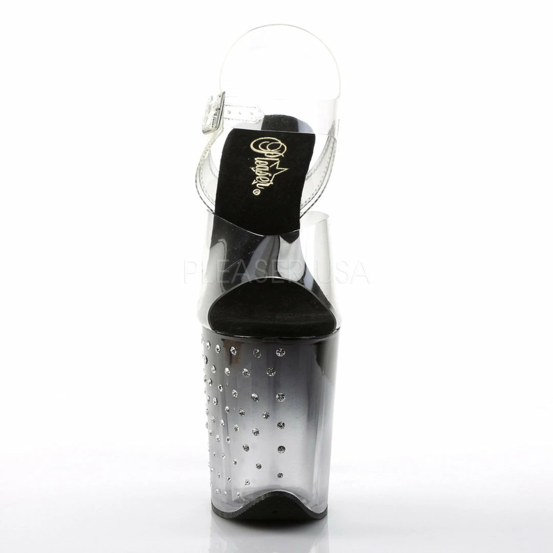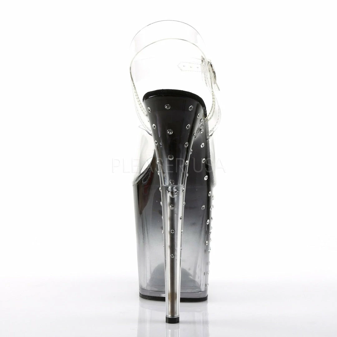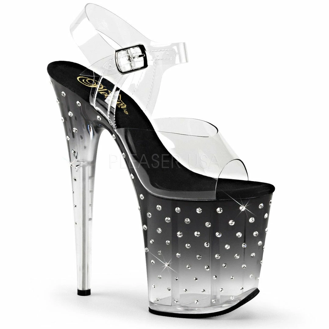 8″ (20.3cm) Heel, 4″ (10.2cm) platform ankle strap sandal featuring tinted, rhinestone studded platform.