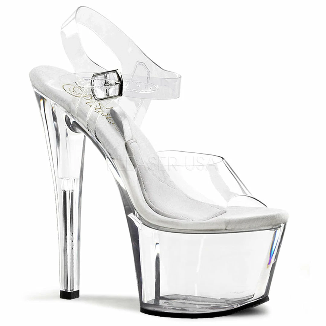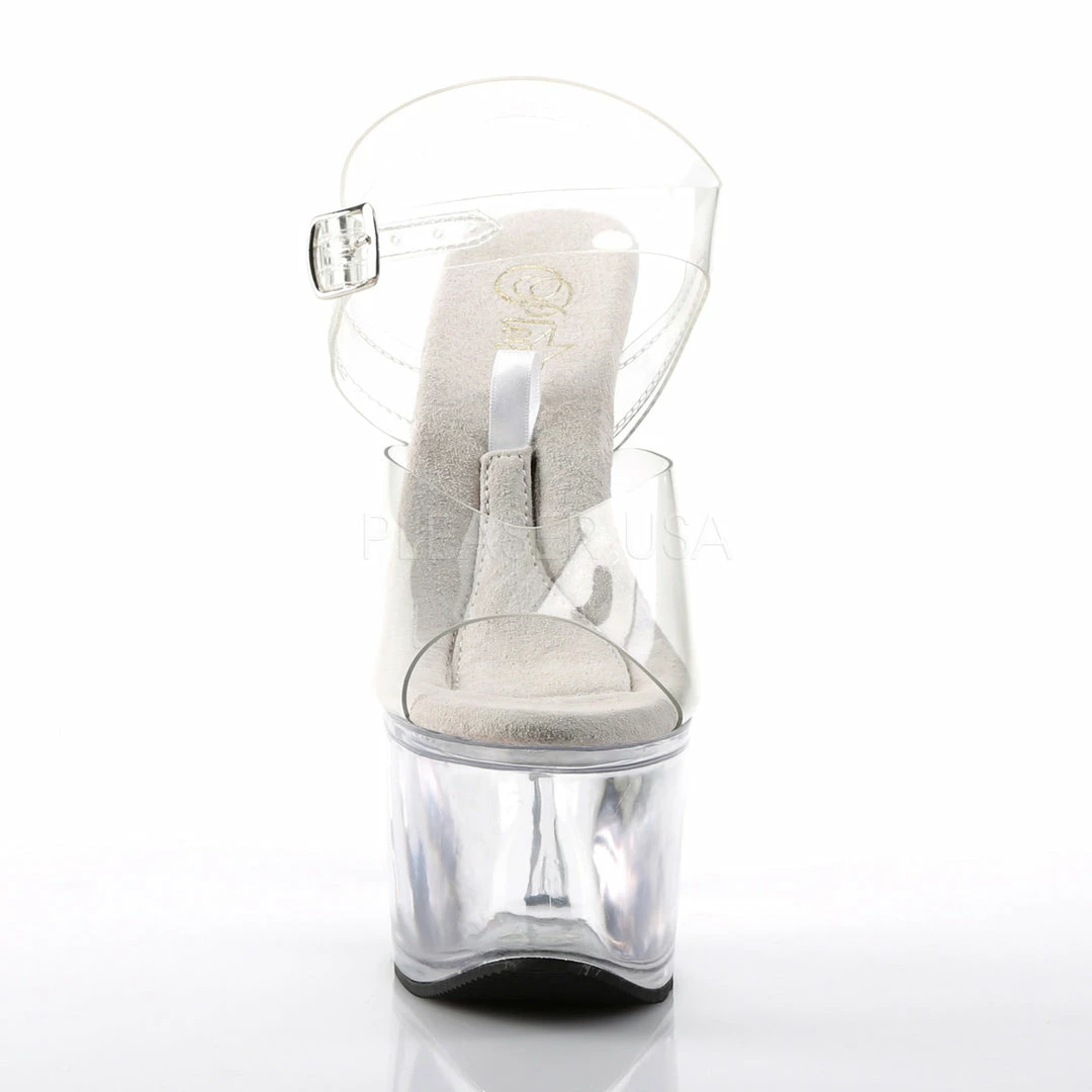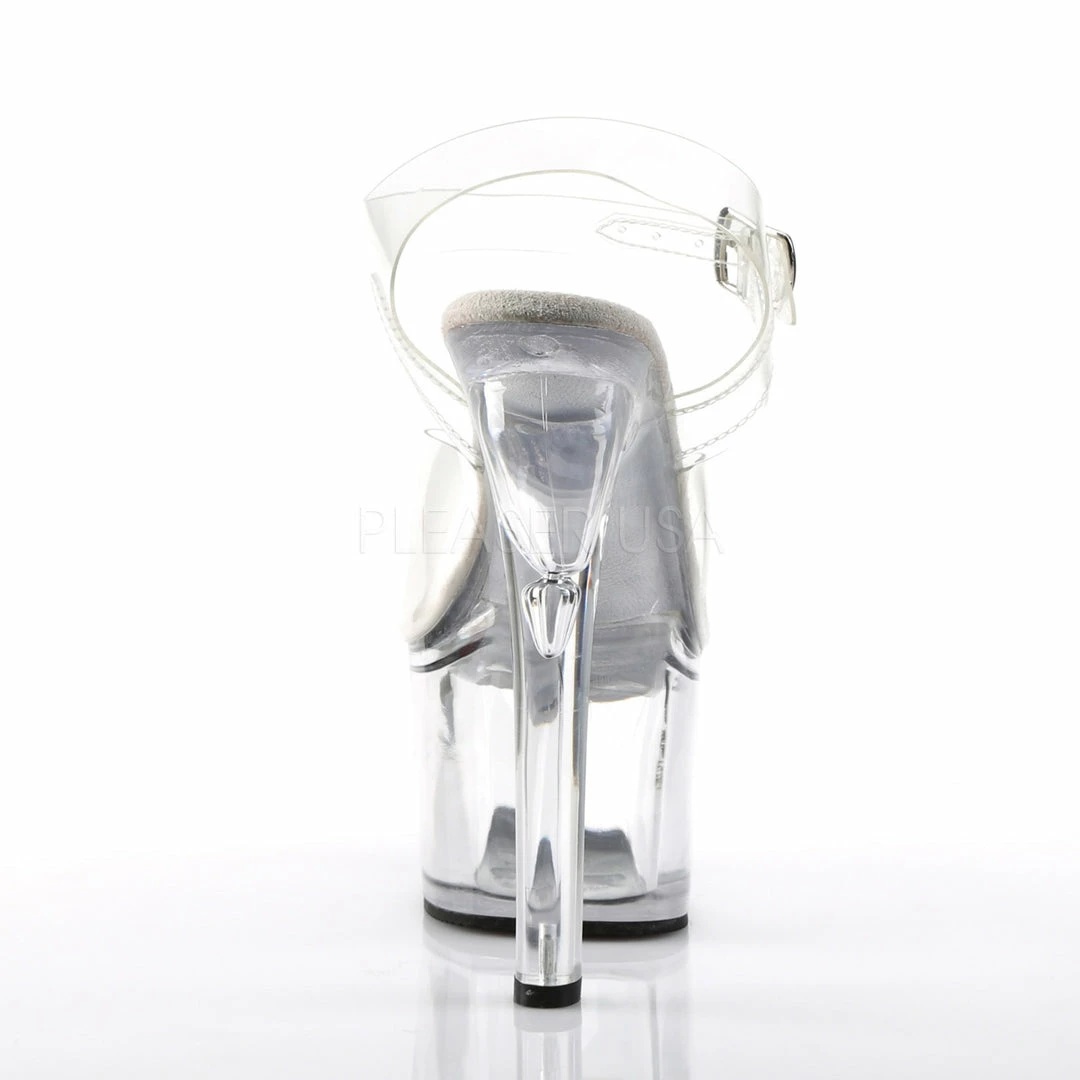 7″ (17.8cm) heel, 2 3/4″ (7cm) platform peep toe ankle strap sandal with accessible compartment.