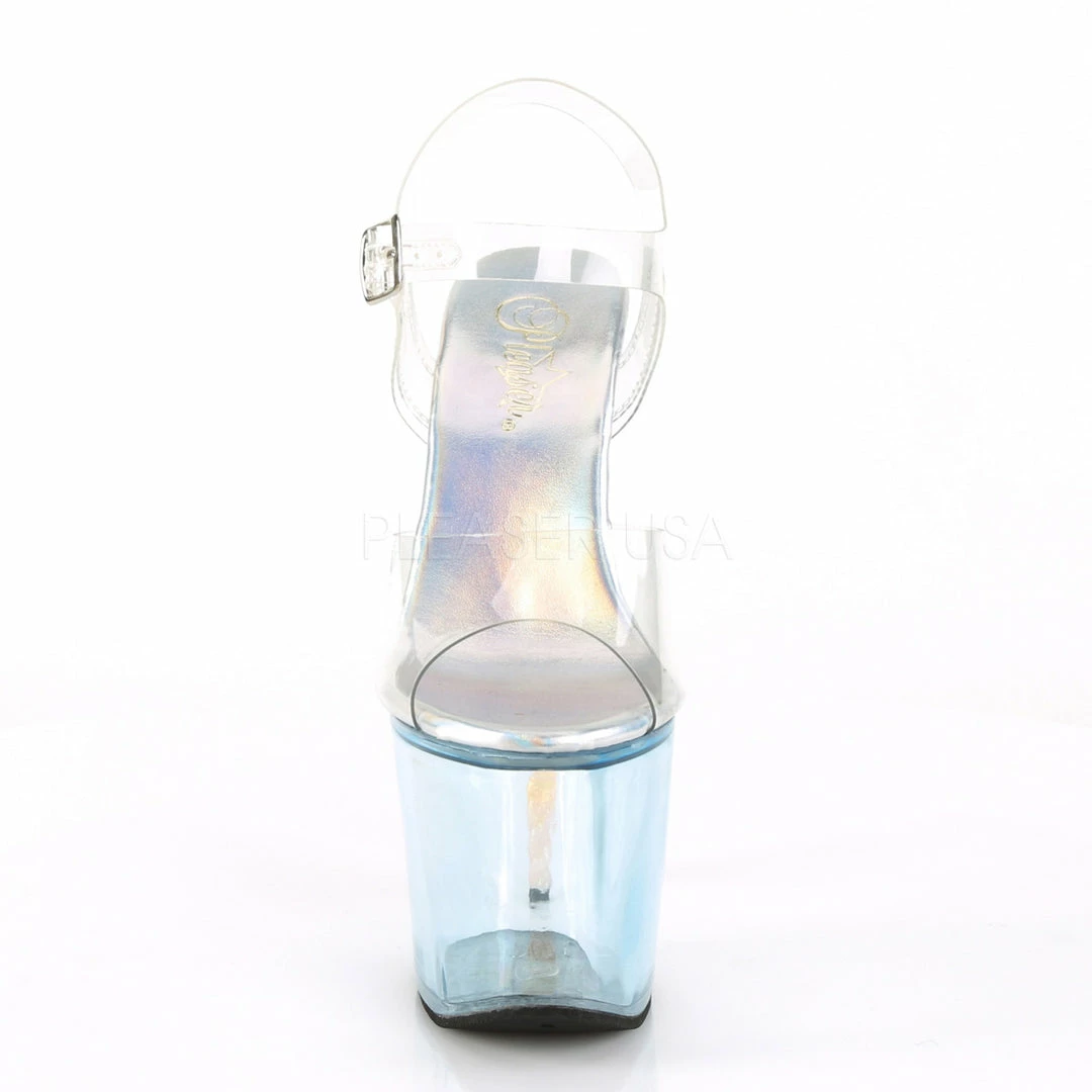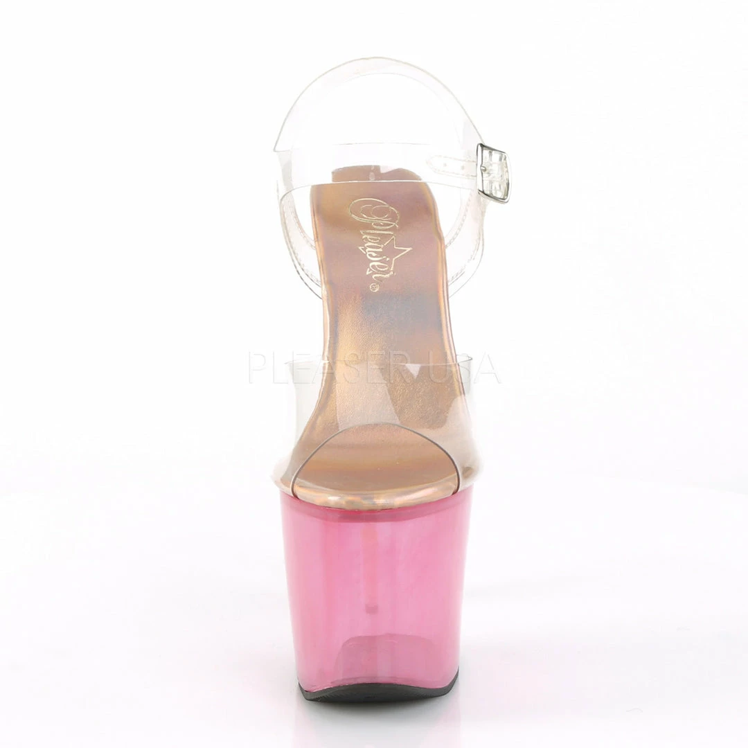 7″ (17.8cm) stiletto heel, 3 1/4″ (8.3cm)Β platform ankle strap sandal featuring tinted platform bottom and glittered ombre unicorn heel.