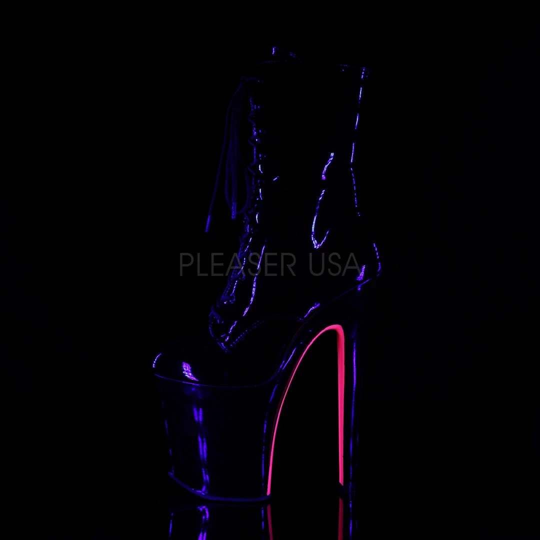 8″ (20.3cm) heel, 4″ (10.2cm) platform lace up front two tone ankle boot featuring blacklight sensitive contrast color inner side of heel and underside of the platform bottom, full inner side zipper.