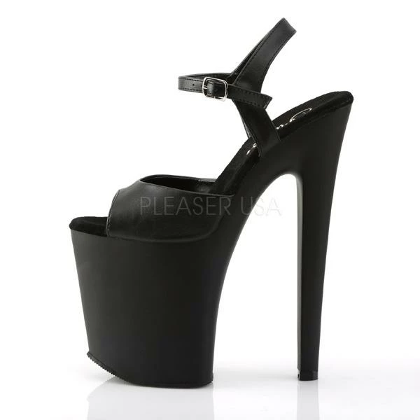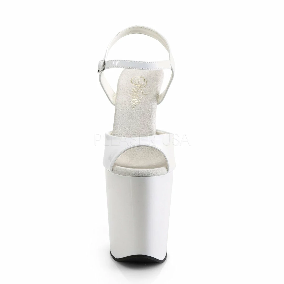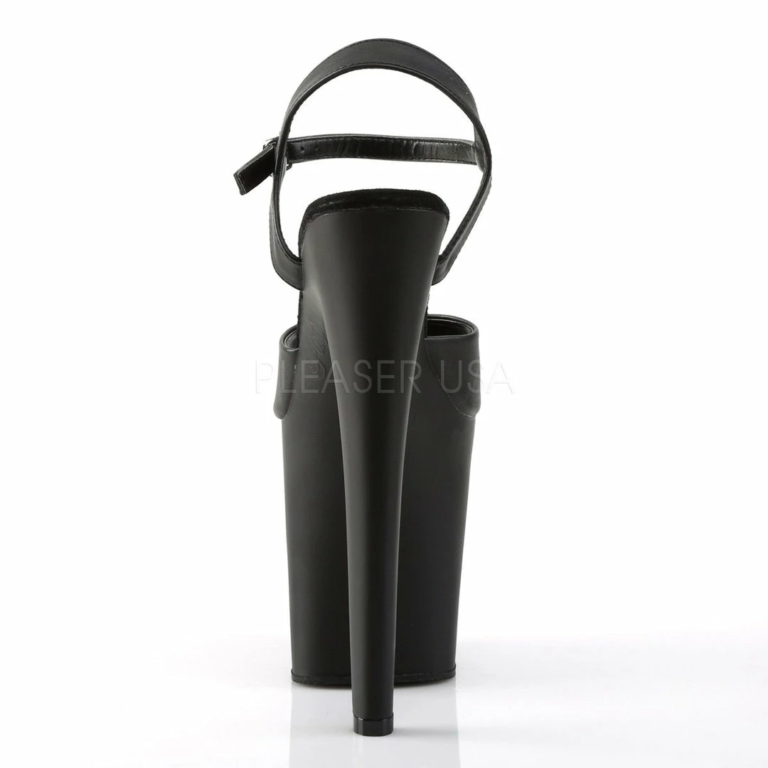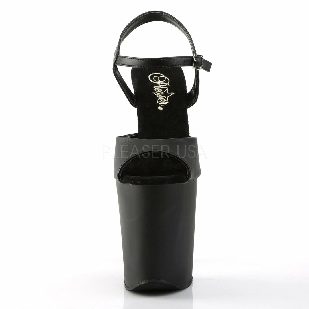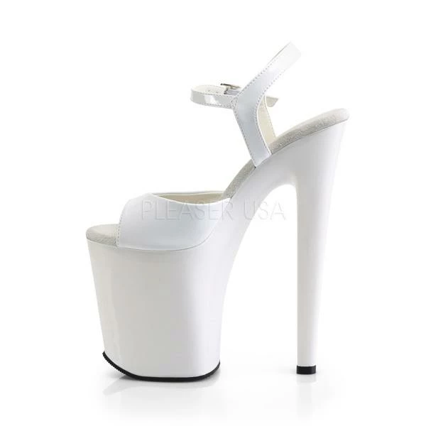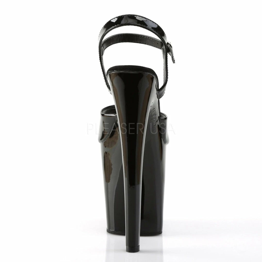 8″ (20.4cm) Heel, 4″ (10.2cm) platform ankle strap sandal.