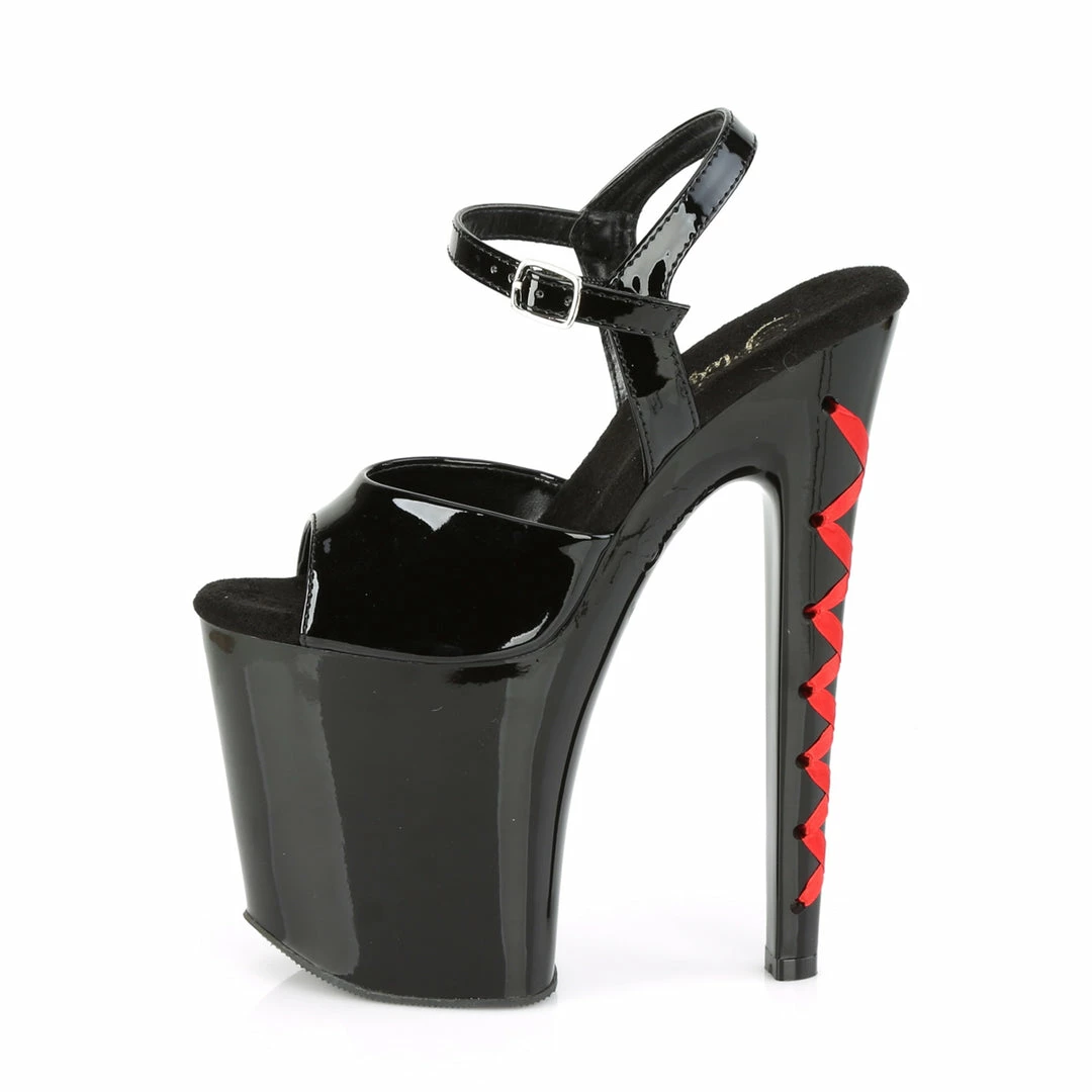 8″ (20.4cm) Heel, 4″ (10.2cm) platform ankle strap sandal featuring contrast color corset laced heel.